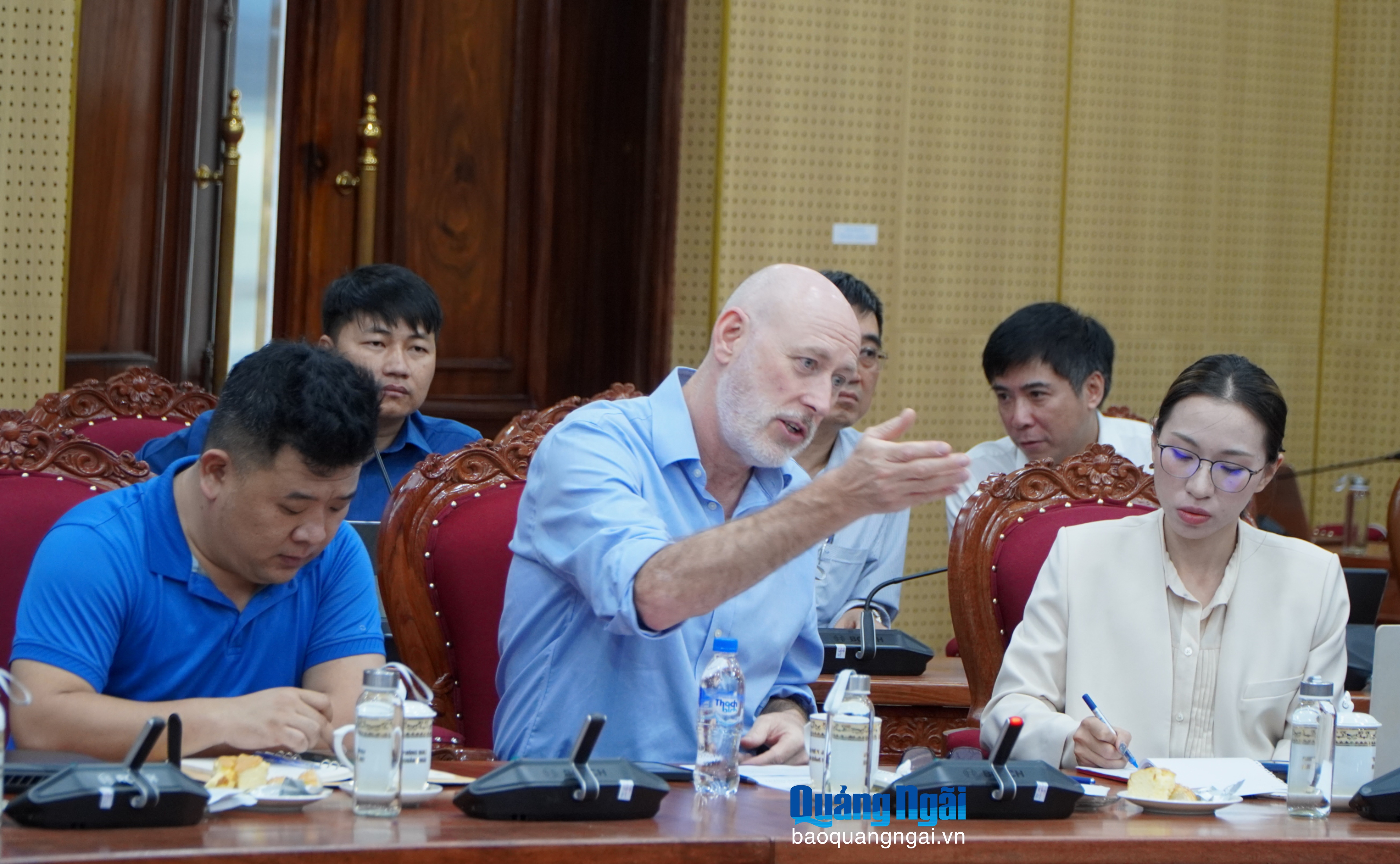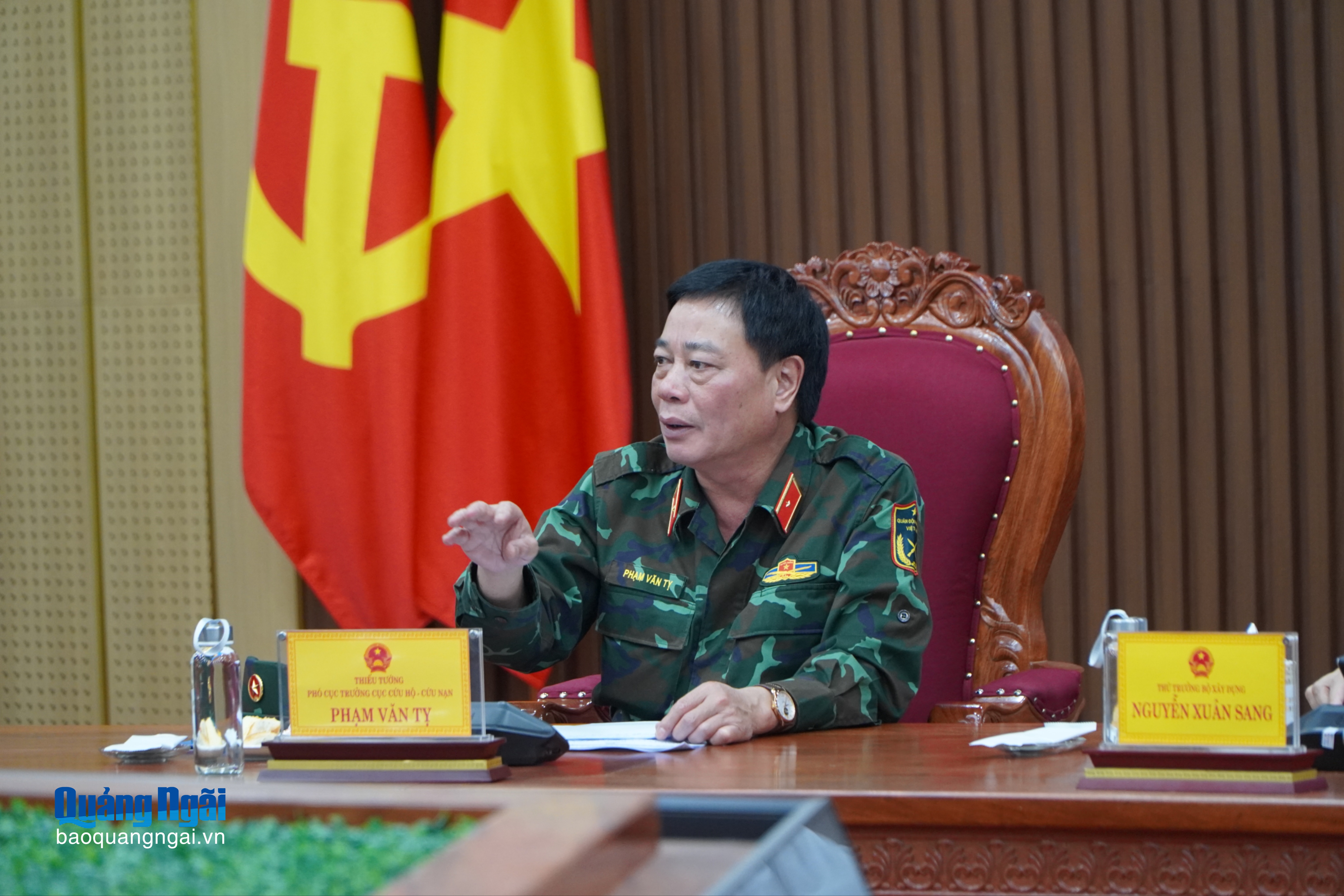 Thứ trưởng Bộ Xây dựng Nguyễn Xuân Sang và lãnh đạo UBND tỉnh Quảng Ngãi, Cục Cứu hộ - Cứu nạn (Bộ Tổng tham mưu Quân đội nhân dân Việt Nam) tại cuộc họp.