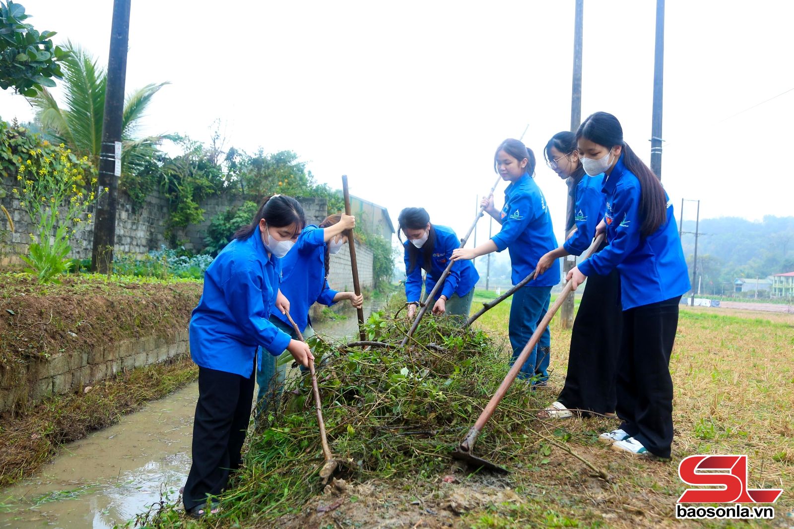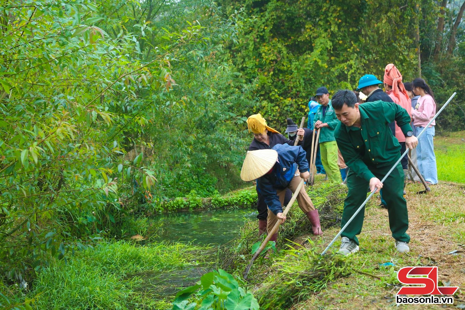 Sinh viên Trường Đại học Tây Bắc tham gia thanh thải lòng suối, thu gom rác thải.