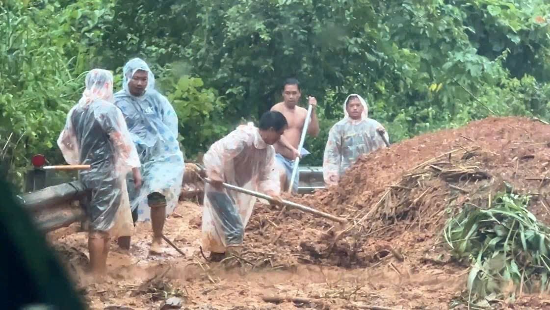 Lực lượng chức năng khẩn trương san gạt đất đá, khơi thông tuyến đường bị sạt lở.