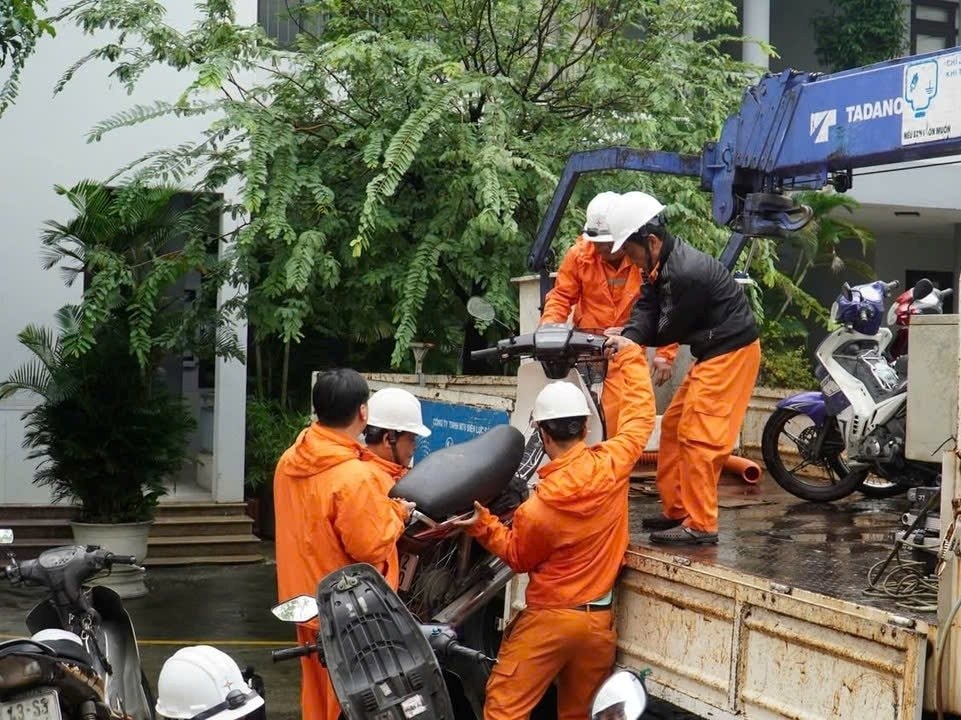 Công nhân điện lực phối hợp đưa xe máy lên thùng xe phục vụ công tác cơ động tại các khu vực bị ngập nặng.