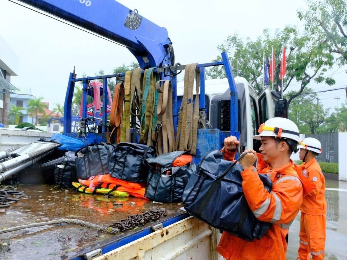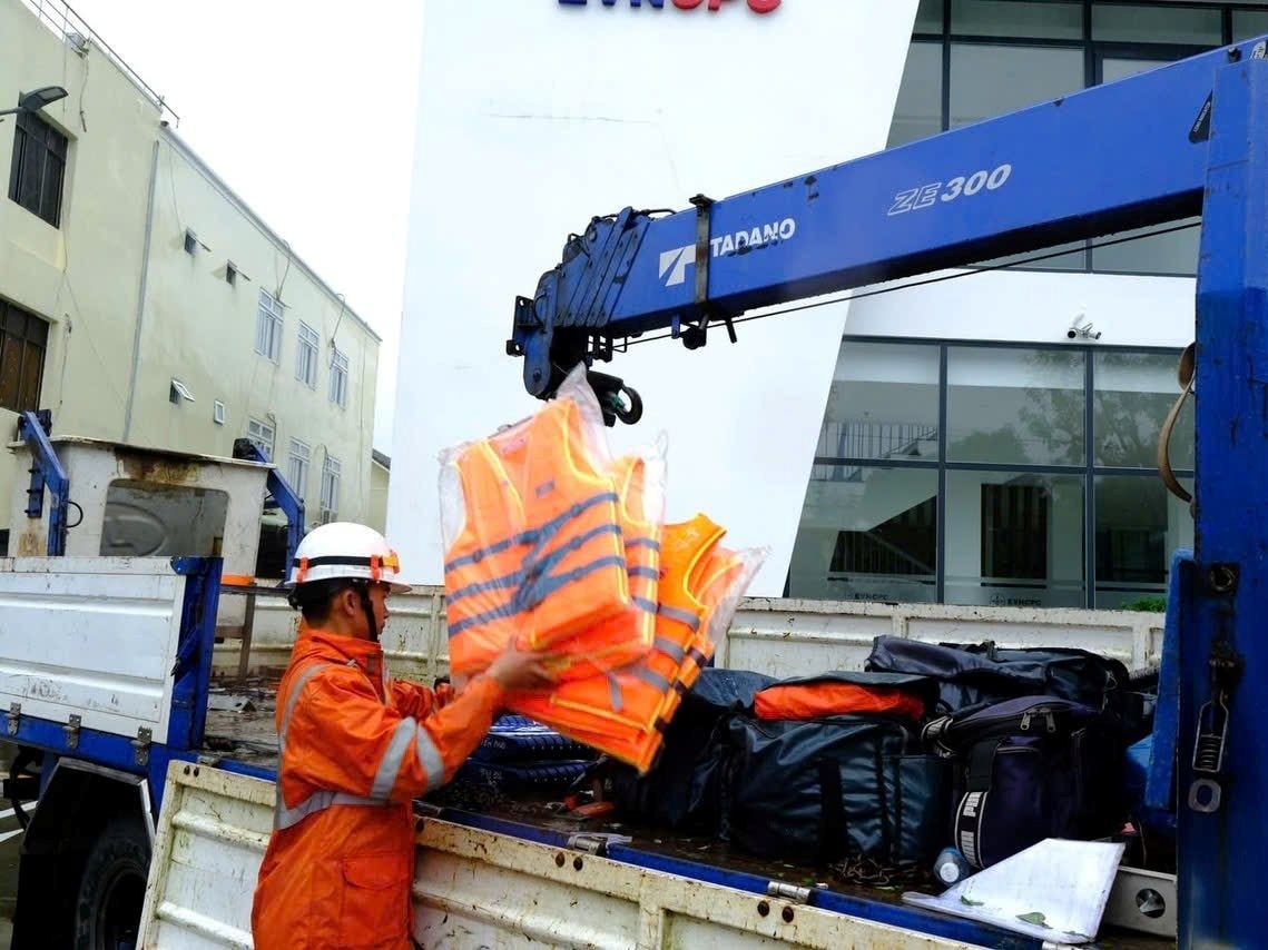 Nhân viên kỹ thuật chuẩn bị áo phao và vật tư an toàn trước khi xuất phát hỗ trợ khôi phục lưới điện.