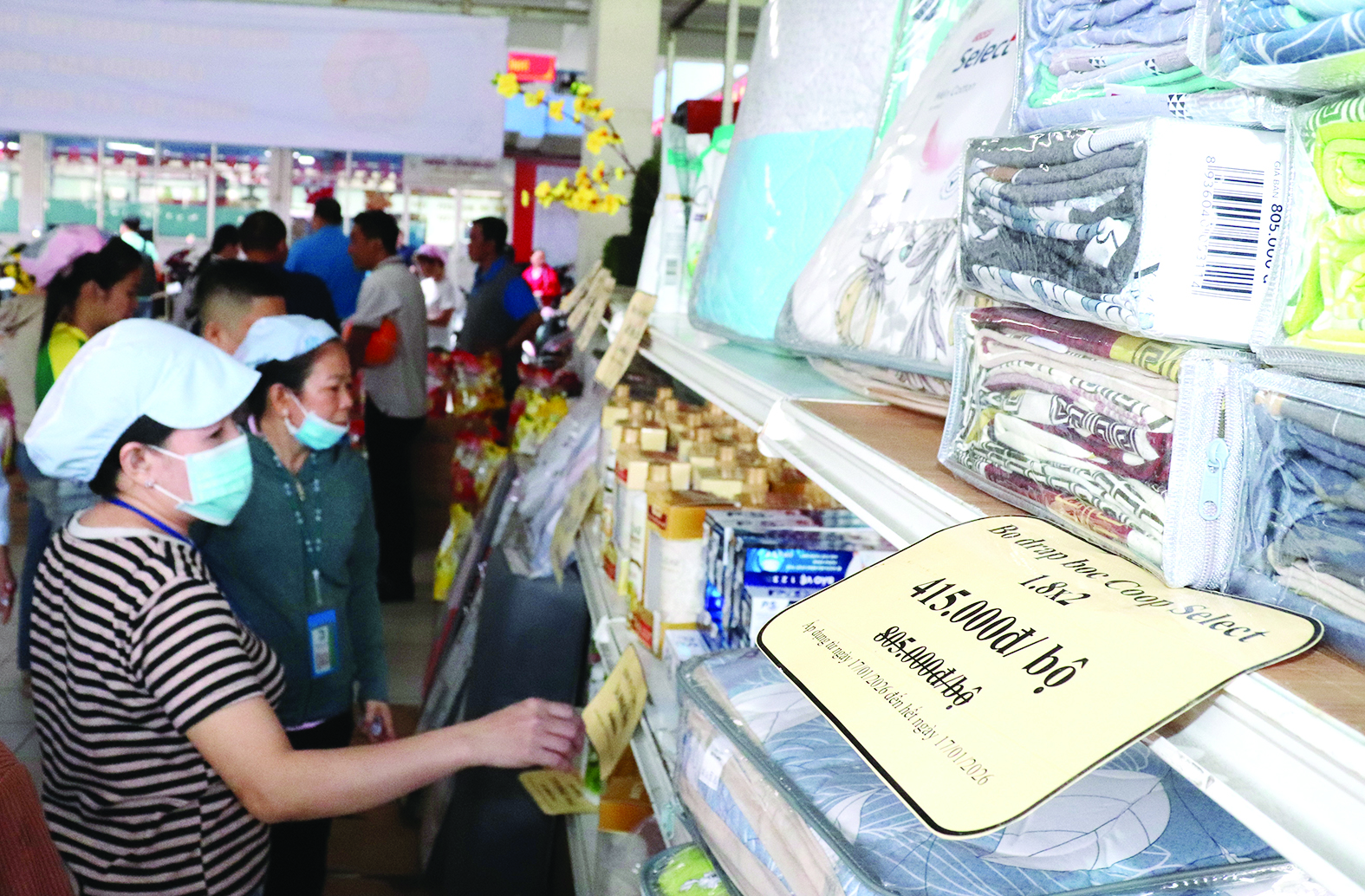 Công nhân mua hàng tết giá ưu đãi tại điểm phúc lợi đoàn viên do LĐLĐ TPHCM tổ chức. ẢNH: THÁI PHƯƠNG