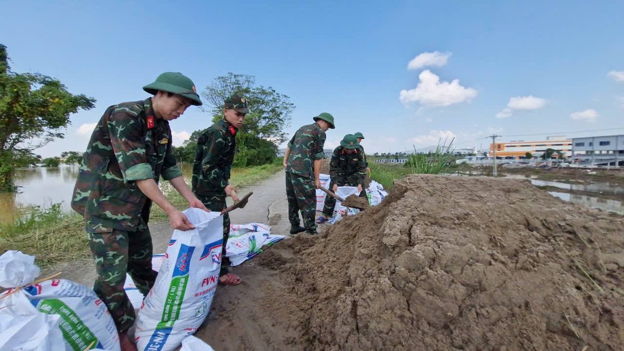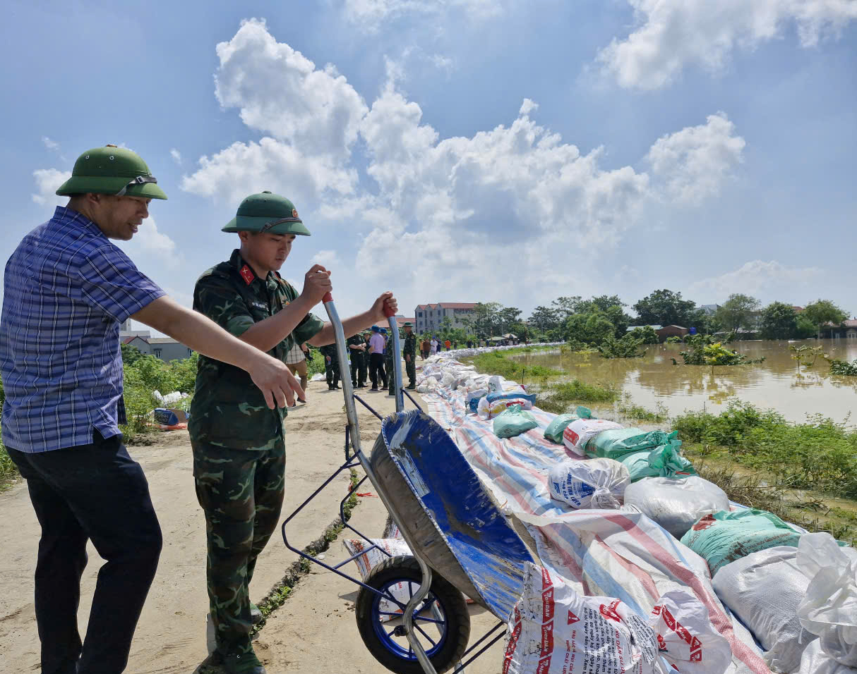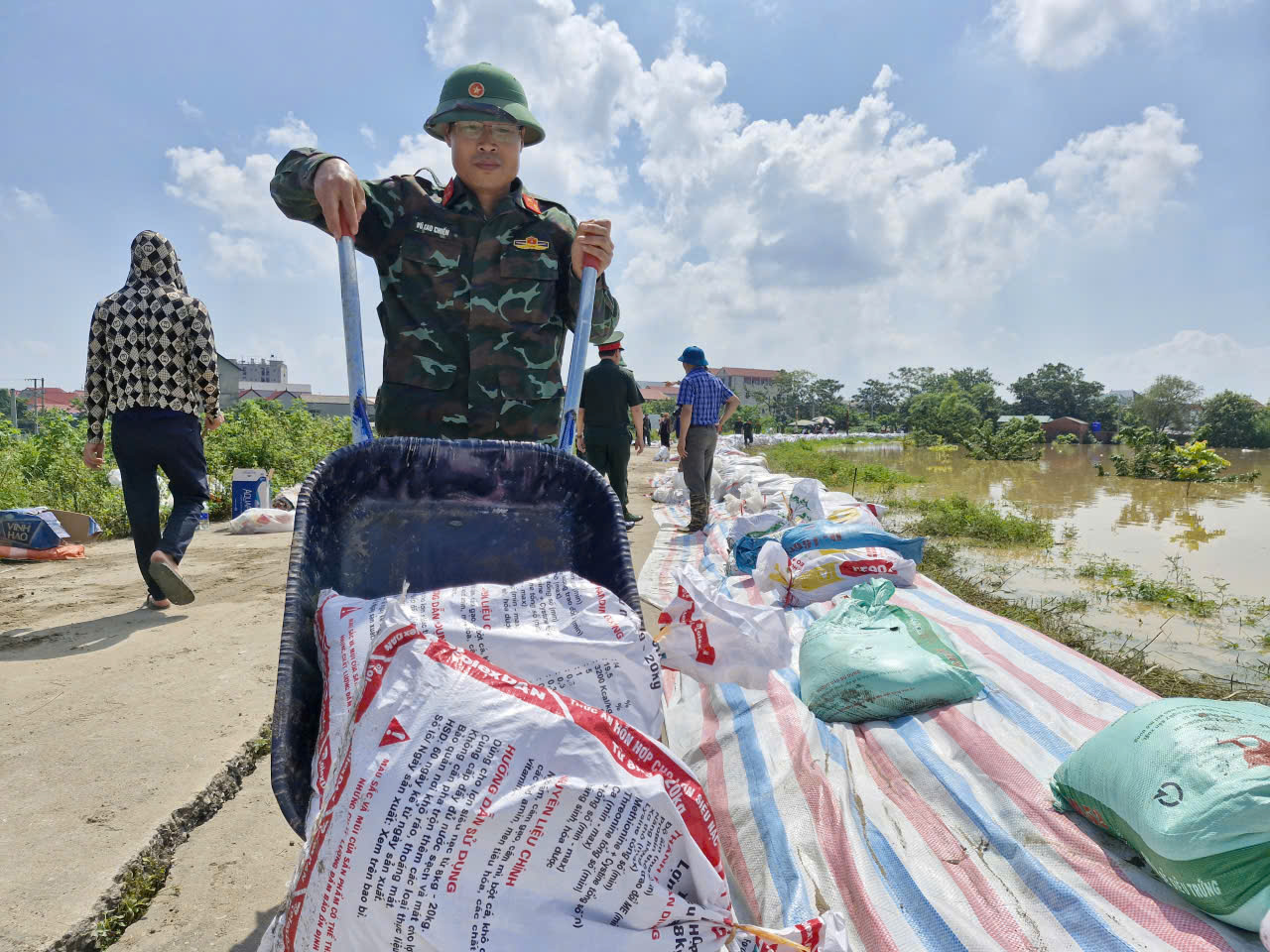 Ngày 9/10, có mặt tại đê tả sông Cầu, đoạn qua K30+600, thuộc thôn Mai Hạ, xã Xuân Cẩm, chúng tôi ghi nhận hàng trăm cán bộ chiến sĩ Bộ Chỉ huy quân sự tỉnh Bắc Ninh và Lữ đoàn 229, Binh chủng Công binh, Bộ Quốc phòng đã được huy động tham gia hộ đê.