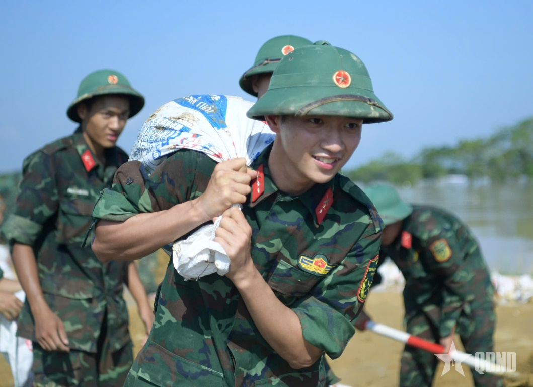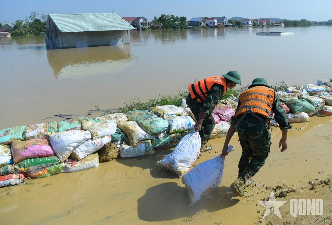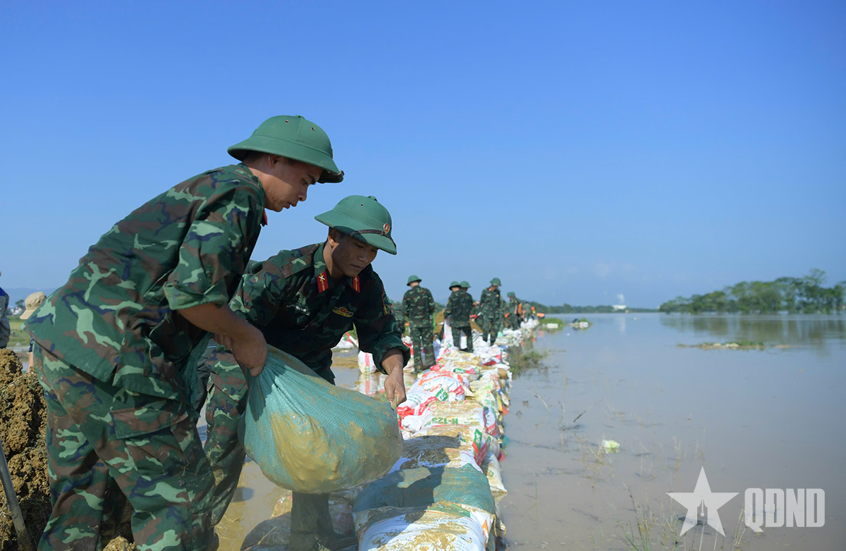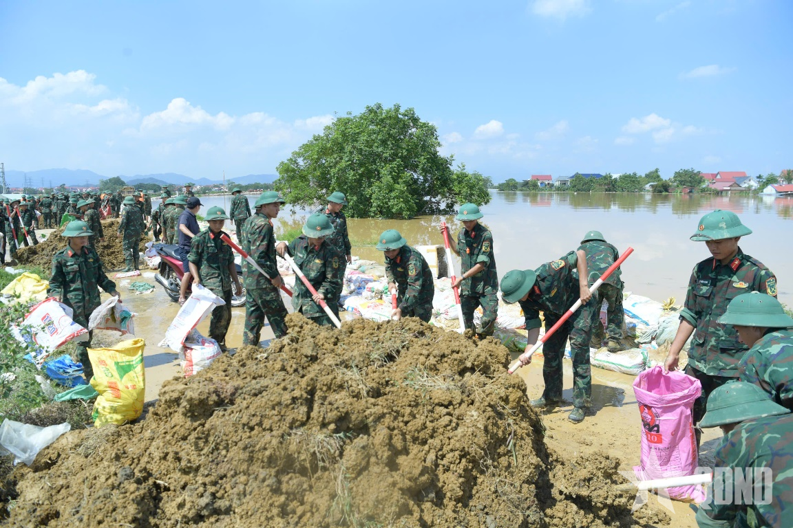 Thượng tá Bùi Xuân Thịnh, Phó sư đoàn trưởng Sư đoàn 3, Quân khu 1 cho biết: “Thực hiện chỉ đạo của cấp trên, ngay từ ngày 6-10, Sư đoàn 3, Quân khu 1 đã huy động từ 600 đến 700 lượt cán bộ, chiến sĩ có mặt tại các điểm xung yếu, cùng nhân dân hộ đê, gia cố bờ sông. Dù thời tiết nắng nóng, các lực lượng vẫn nỗ lực ngày đêm, quyết tâm bảo vệ an toàn tuyến đê và ổn định cuộc sống nhân dân. Dù thực hiện nhiệm vụ với tinh thần khẩn trương, quyết tâm cao nhất nhưng mực nước tiếp tục dâng, nhiều đoạn đê có nguy cơ bị vỡ. Các lực lượng đã triển khai cứu hoa màu giúp dân và chuẩn bị các phương án cứu hộ, cứu nạn tại khu vực ngập sâu".