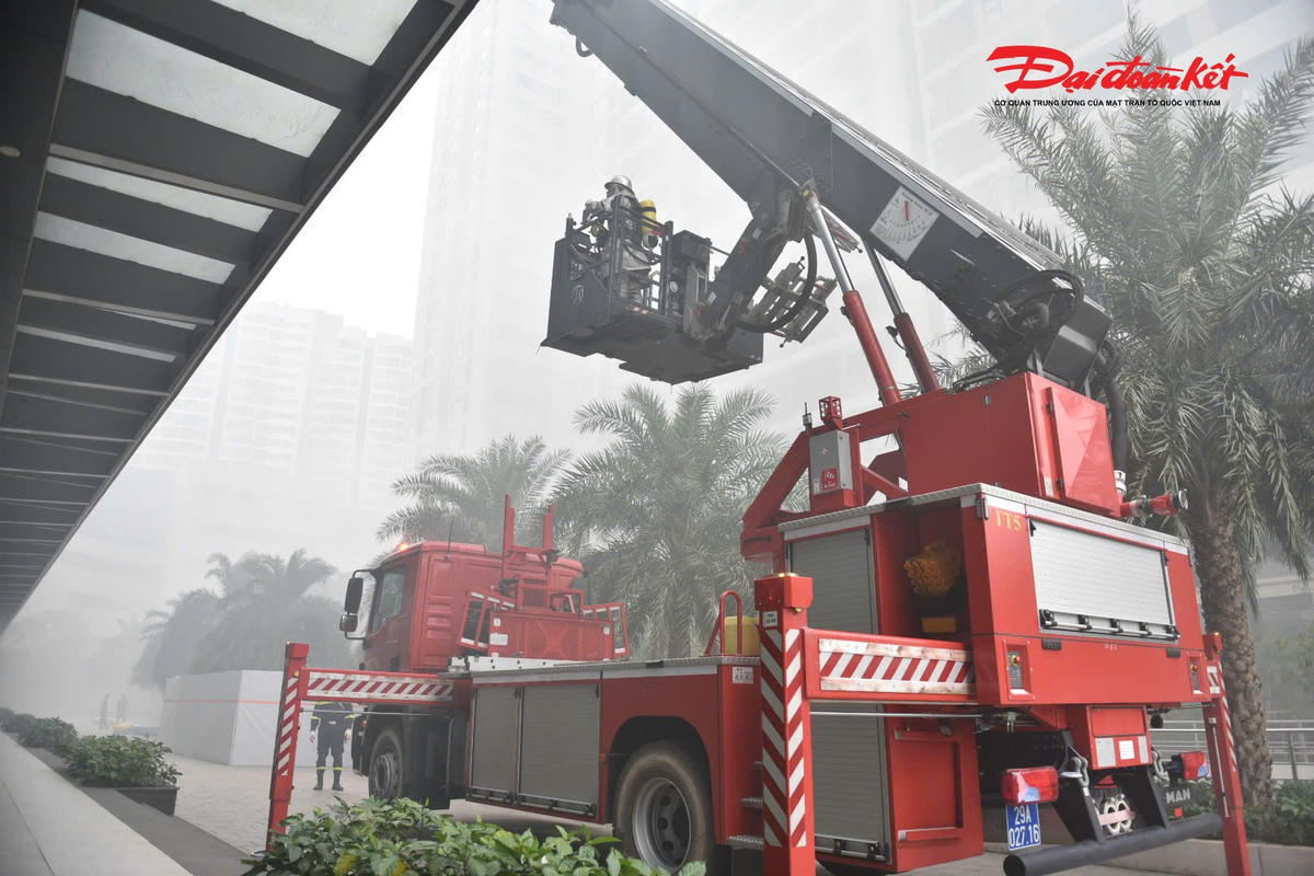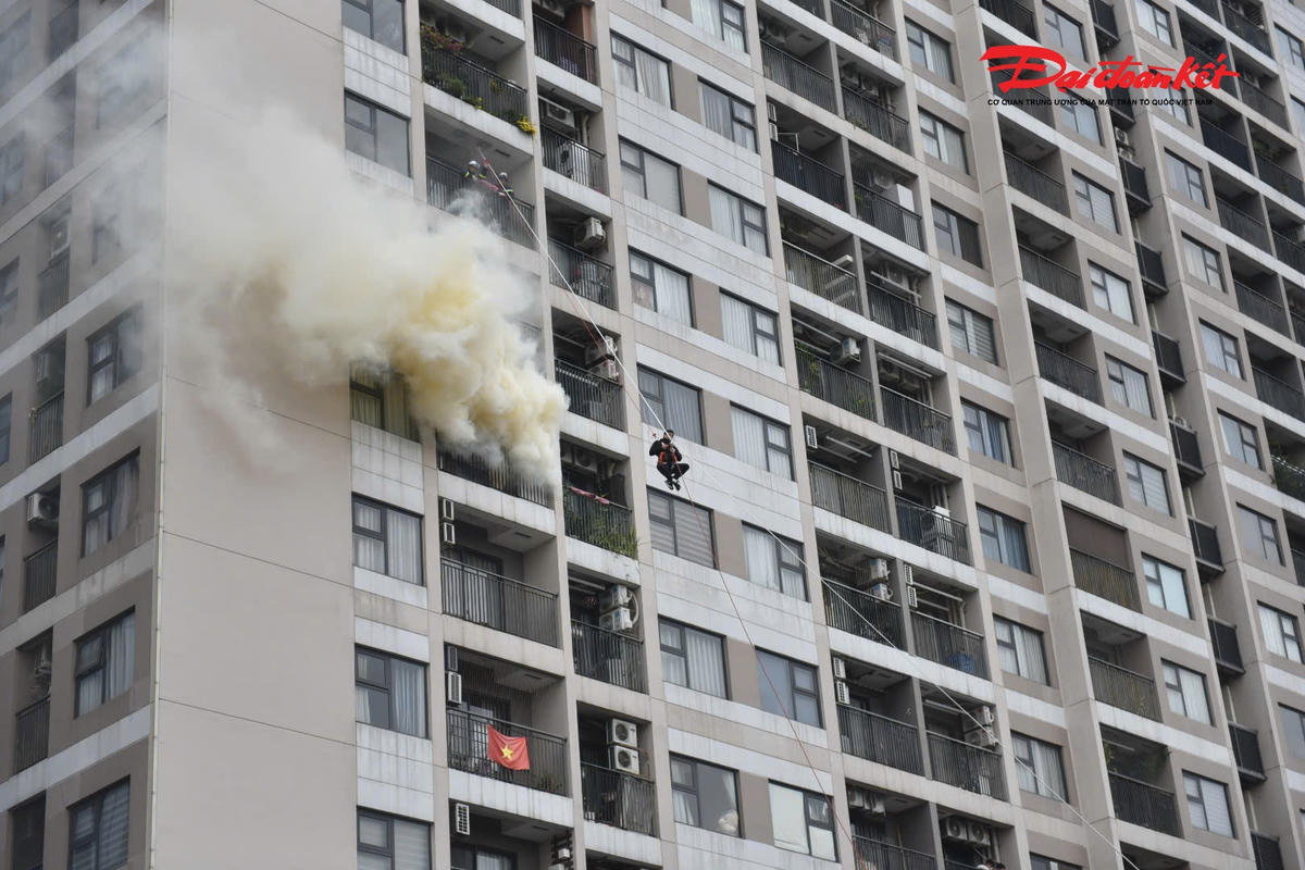 Lực lượng Cảnh sát PCCC&CNCH đã triển khai đồng bộ nhiều biện pháp cứu người như xe thang, ống tụt, cầu dây nghiêng, cáng cứu thương và mặt nạ lọc độc tại các độ cao khác nhau.