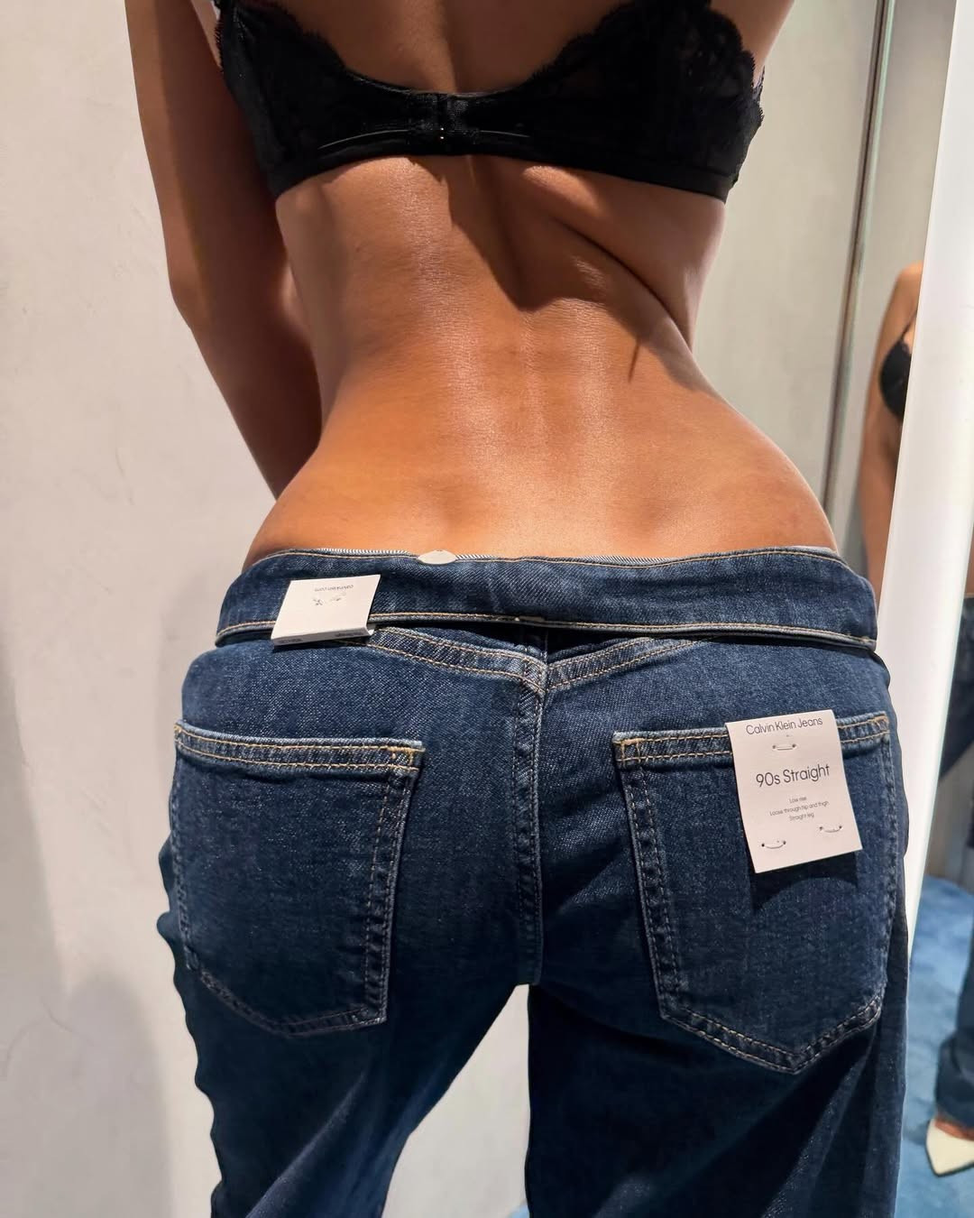 Những bức ảnh chụp trong phòng thử đồ, kết hợp cùng chiếc quần jeans cạp trễ và nội y ren đen, đã làm nổi bật vòng eo săn chắc, bờ lưng "thắt đáy lưng ong" và vòng ba đầy đặn. (Ảnh: IGNV)