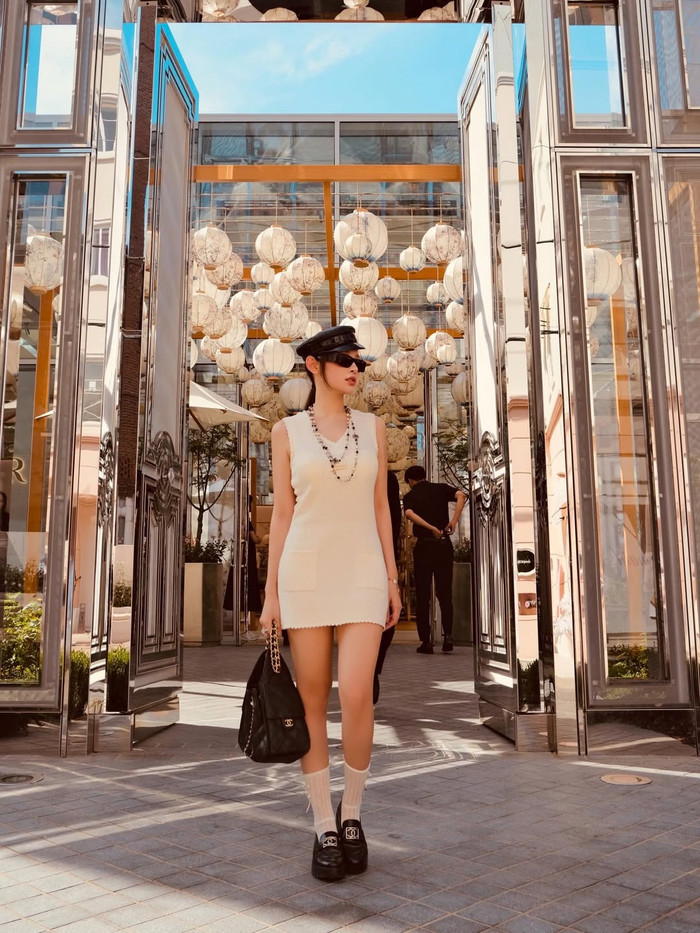 Trang phục được phối cùng phụ kiện như mũ, kính râm và túi xách, tạo tổng thể trẻ trung nhưng vẫn giữ được sự thanh lịch quen thuộc. Cách kết hợp trang phục không quá cầu kỳ song vẫn thể hiện rõ gu thẩm mỹ cá nhân của cựu hot girl Hà thành.