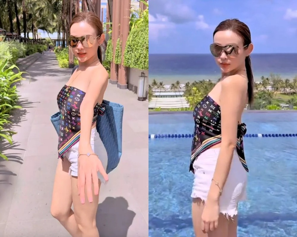Trong loạt ảnh được đăng tải, Huyền Baby tận hưởng không khí trong lành tại một resort ven biển, khoe trọn vóc dáng mảnh mai bên hồ bơi vô cực. Cô nàng diện quần shorts trắng rách gấu, khoe đôi chân thon dài, kết hợp cùng chiếc kính râm bản to cực kỳ sành điệu.