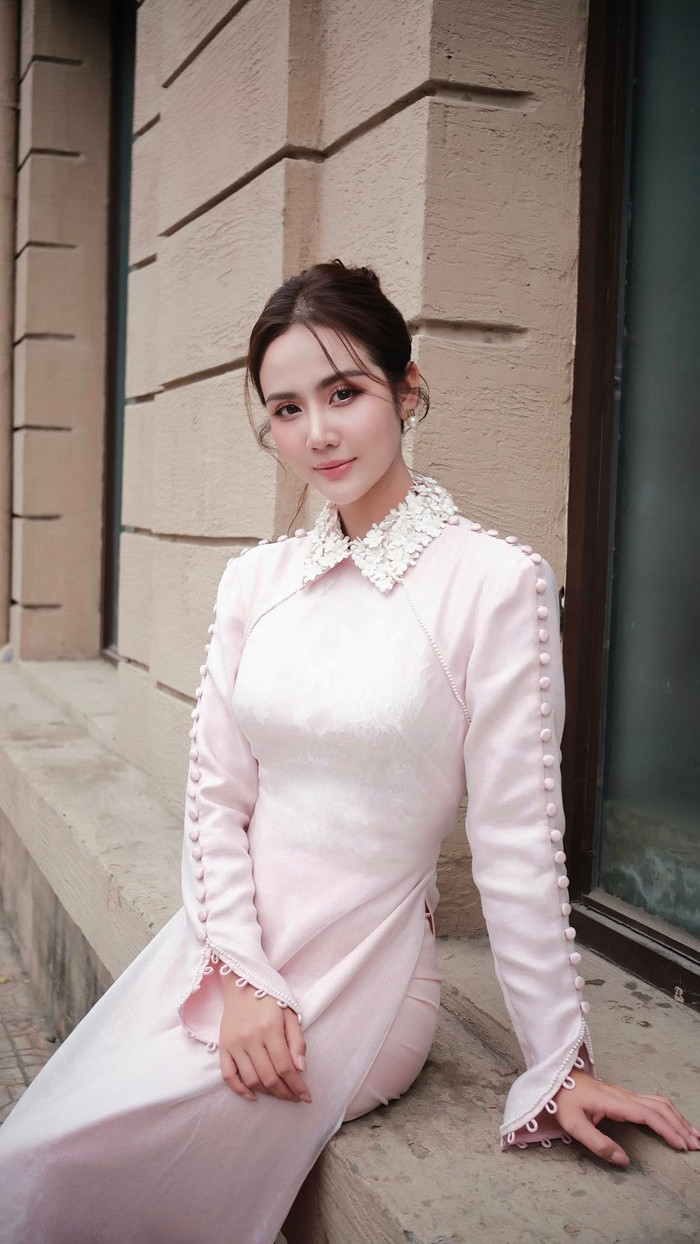 Trong loạt ảnh vừa được chia sẻ, Huyền Lizzie xuất hiện với vẻ ngoài rạng rỡ, nhẹ nhàng trong trang phục áo dài gam hồng pastel. Thiết kế áo dài có phom dáng thanh lịch, phần cổ được điểm xuyết họa tiết hoa nổi tinh xảo, giúp tổng thể trở nên trang nhã nhưng không kém phần nổi bật. Nữ diễn viên lựa chọn kiểu tóc gọn gàng, kết hợp lối trang điểm trong veo, tôn lên đường nét gương mặt hài hòa và khí chất dịu dàng.
