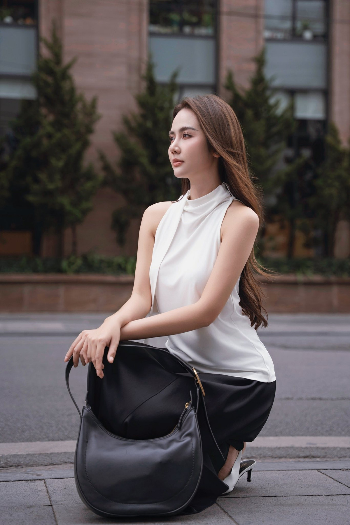 Nữ diễn viên khéo léo tạo dáng giữa không gian kiến trúc cổ kính, càng làm nổi bật vẻ đẹp hoài niệm, trầm lắng nhưng đầy cuốn hút.