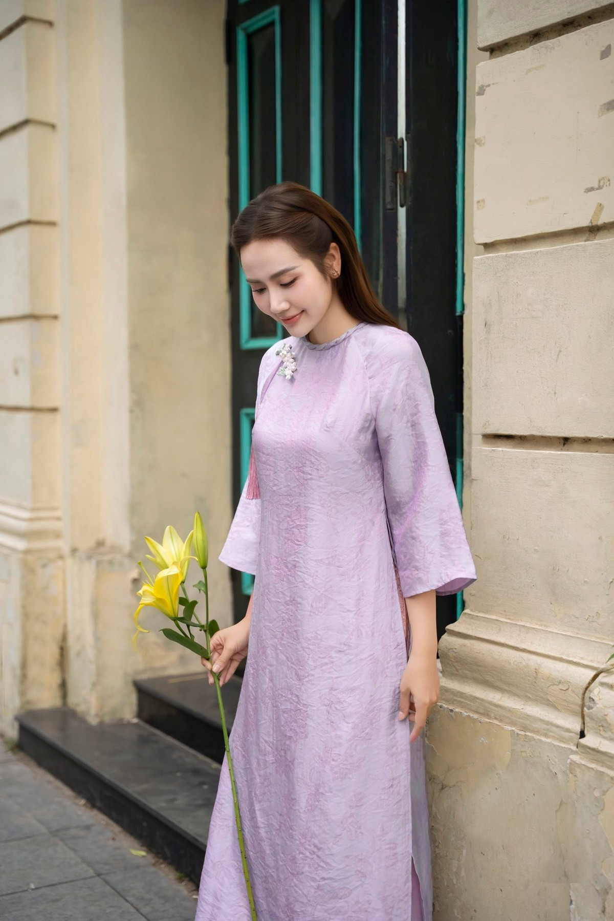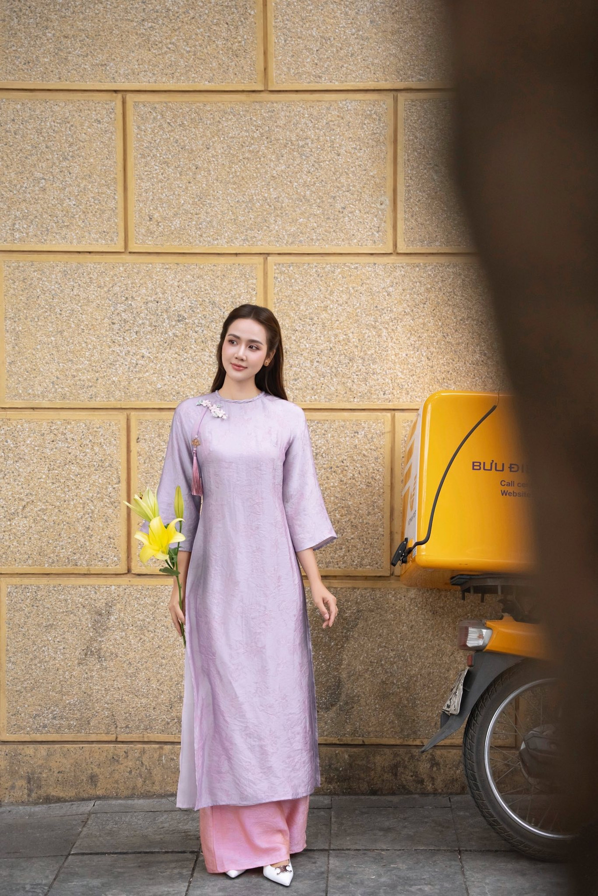 Trong những khung hình được ghi lại, Huyền Lizzie diện áo dài tông tím nhạt, thiết kế tối giản nhưng tinh tế. Phần phom dáng mềm mại kết hợp chất liệu nhẹ giúp tổng thể trở nên thanh thoát, uyển chuyển theo từng cử động.
