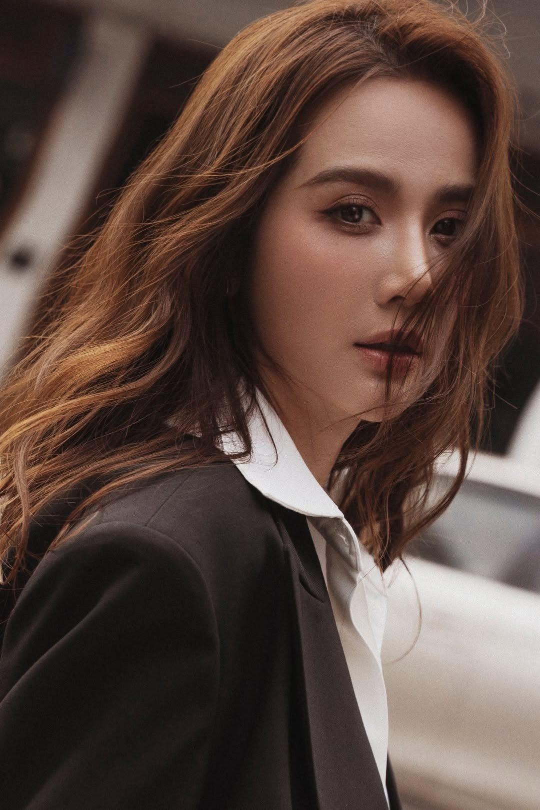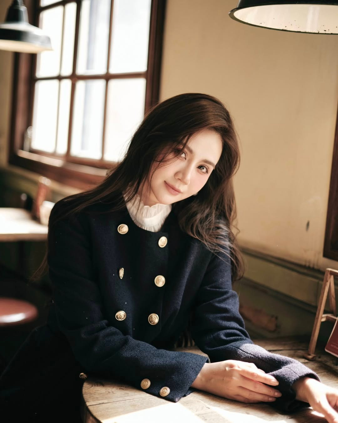 Gương mặt của nữ diễn viên trở thành tâm điểm: làn da sáng mịn, đôi mắt trong trẻo và sống mũi cao thanh thoát. Nụ cười nhẹ nhàng và ánh nhìn dịu dàng dưới ánh sáng tự nhiên làm khán giả liên tưởng đến hình ảnh nữ chính trong những bộ phim lãng mạn xứ kim chi. Mái tóc dài buông nhẹ, được tạo phồng nhẹ nhàng, bắt trọn vibe Hàn Quốc mềm mại và nữ tính.