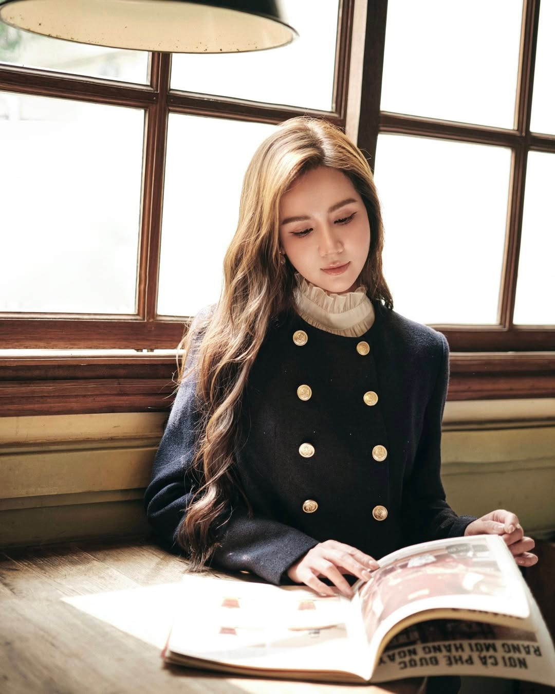 Khoảnh khắc Huyền Lizzie ngồi trong một quán cà phê nhỏ, đón ánh nắng dịu buổi sáng, tạo nên một khung hình mang đậm chất điện ảnh, tinh tế và vô cùng cuốn hút.