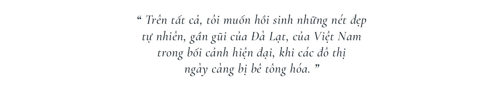 - Khi được mời tham gia dự án, tôi hoàn toàn không biết gì về Đà Lạt, vì vậy tôi đã quyết định đến thăm và tự mình cảm nhận. Việc đi bộ xung quanh khu đất dự án mang lại trải nghiệm hoàn toàn khác biệt so với việc xem ảnh, và ngay từ chuyến thăm đầu tiên đã để lại ấn tượng mạnh mẽ trong tôi về sự độc đáo của nơi này.