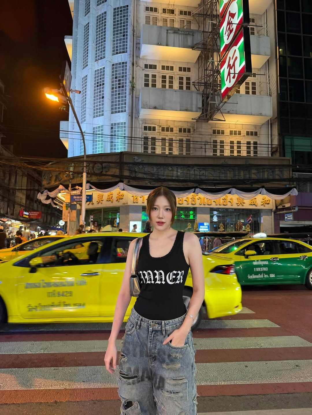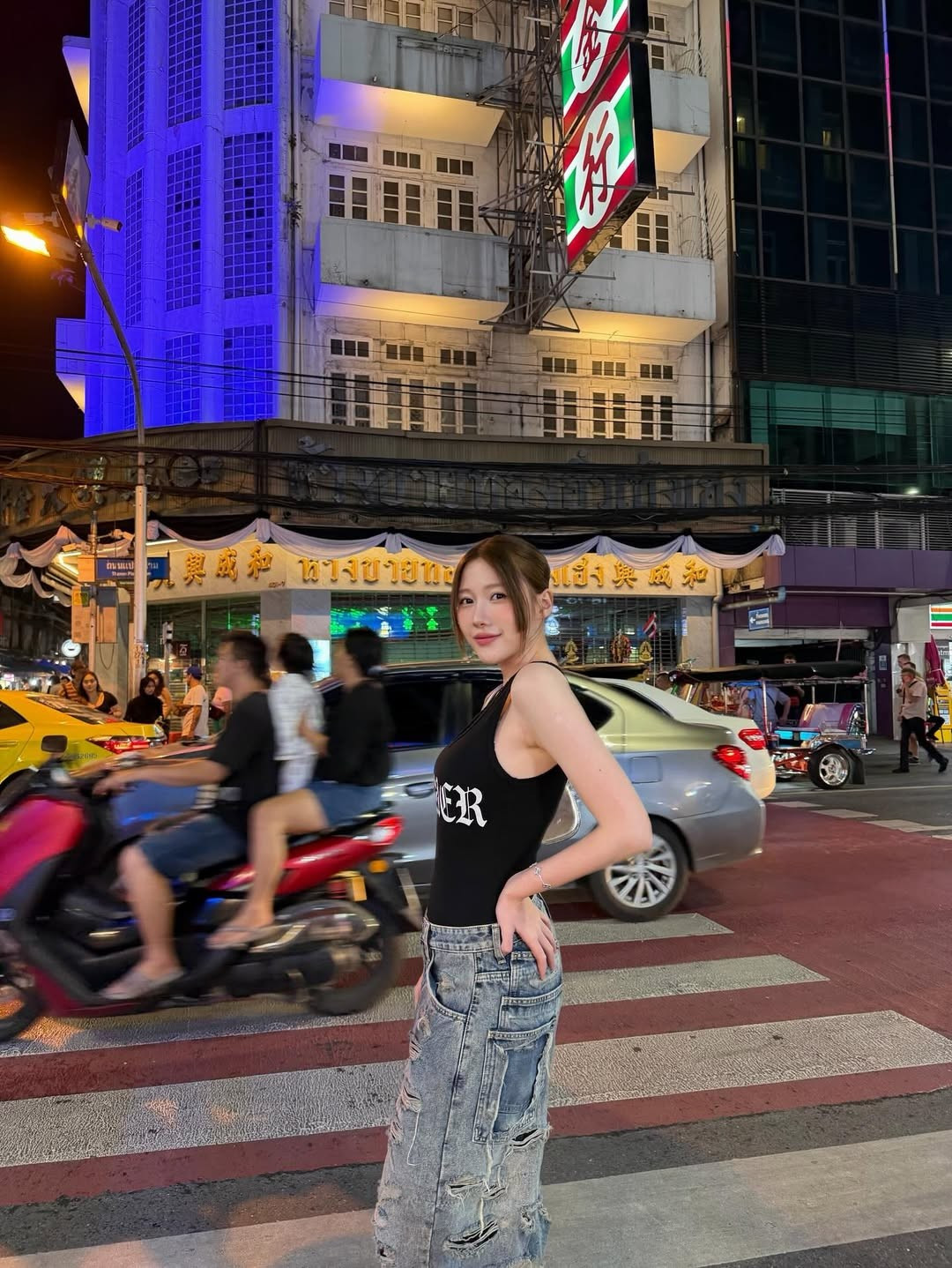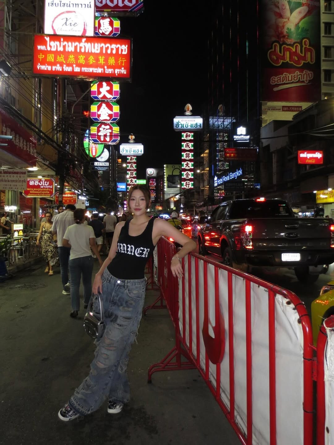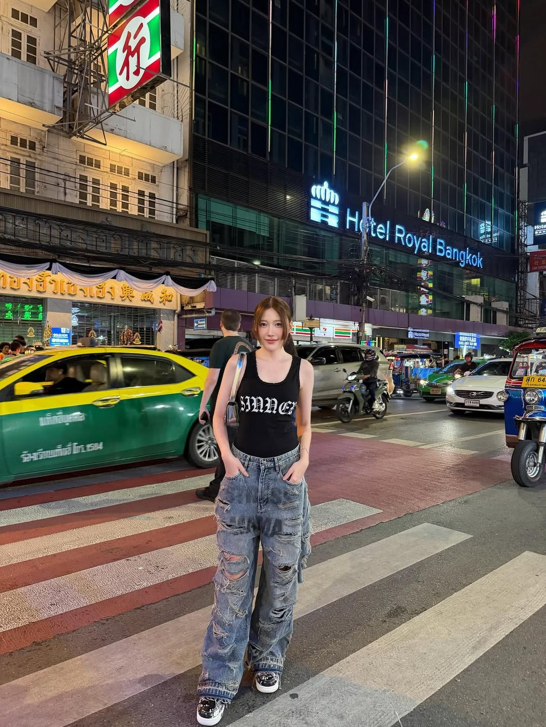 Uyển Ân tự tin tạo dáng "cool ngầu", đút tay vào túi quần, đứng trên vạch sang đường. Bối cảnh phía sau là đường phố Bangkok tấp nập xe cộ, với những chiếc taxi xanh-vàng, xe tuk-tuk và các biển hiệu đặc trưng như "Hotel Royal Bangkok" và "7-Eleven".