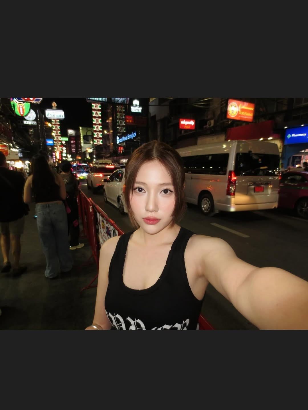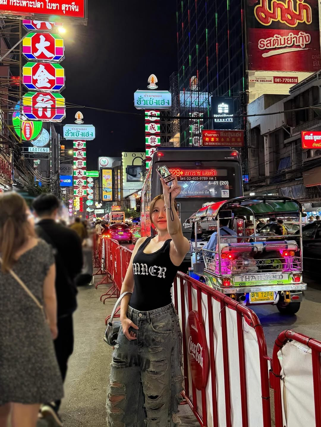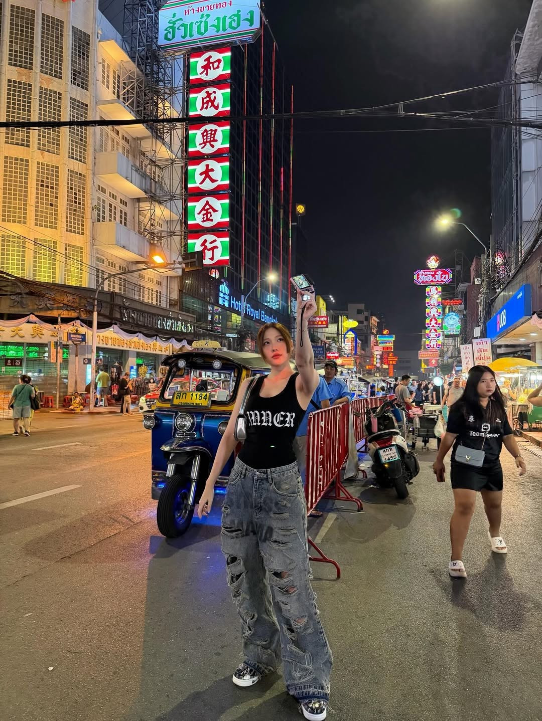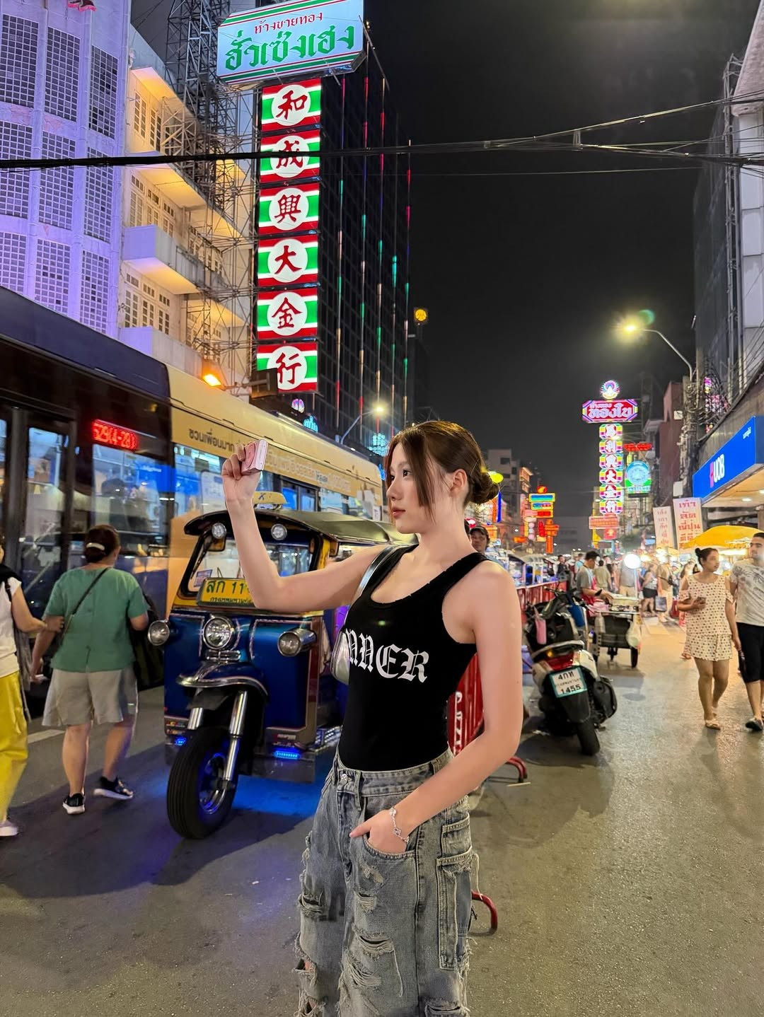 Uyển Ân tự tin tạo dáng "cool ngầu", đút tay vào túi quần, đứng trên vạch sang đường. Bối cảnh phía sau là đường phố Bangkok tấp nập xe cộ, với những chiếc taxi xanh-vàng, xe tuk-tuk và các biển hiệu đặc trưng như "Hotel Royal Bangkok" và "7-Eleven".