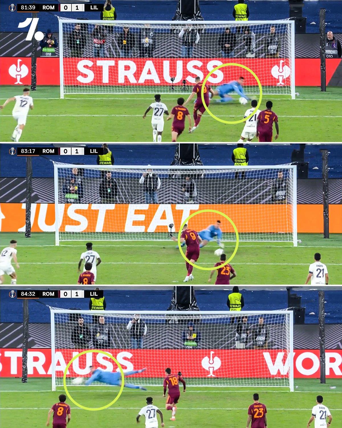 Trước cơ hội lớn để gỡ hòa, Artem Dovbyk lãnh trách nhiệm, nhưng cú sút vào góc thấp bên phải bị thủ thành Berke Ozer cản phá. Do có cầu thủ Lille sớm vào vòng 16m50 nên trọng tài cho đá lại. Dovbyk sút và lại bị Ozer ngăn chặn. Lần này, Ozer phạm luật khi không giẫm chân lên vạch vôi. Đá lại, Roma đổi người đá penalty. Cơ hội dành cho Matias Soule. Nhưng, cú sút của người thay thế cũng không thắng nổi Ozer! Cuối cùng, không còn lý do nào để trọng tài cho Roma đá lại và Roma ngậm ngùi thua 0-1 trước Lille ngay trên sân nhà Olimpico.