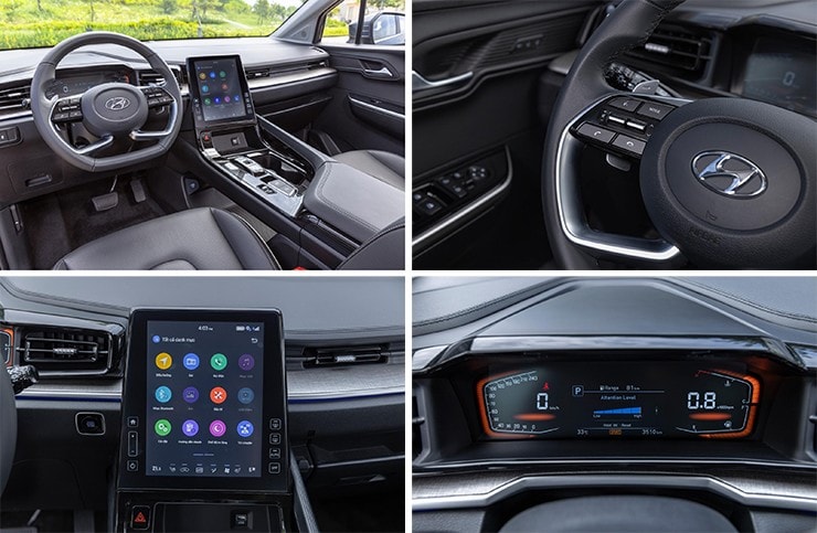 Khoang cabin của Hyundai Custin tập trung vào trải nghiệm của người dùng với màn hình dọc 10,4 inch tích hợp bản đồ dẫn đường dành riêng cho Việt Nam. Cần số dạng nút bấm hiện đại cùng vô-lăng tích hợp lẫy chuyển số mang lại sự tiện nghi tối đa.