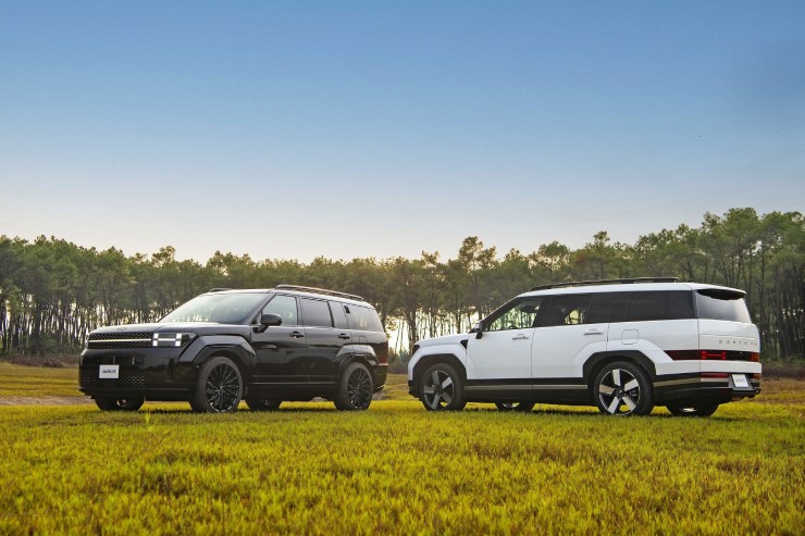Trong đó, ngoại thất SantaFe 2025 tổng thể có phong cách vuông vức, bề thế và đậm chất SUV hơn. Kích thước xe đạt 4.830 x 1.900 x 1.720 mm, trục cơ sở 2.815 mm, dài và cao hơn trước. Thiết kế đầu xe thay đổi mạnh mẽ và là điểm dễ nhận biết nhất. Lưới tản nhiệt chữ nhật sơn đen kéo dài sang hai bên, liền mạch với hệ thống chiếu sáng.