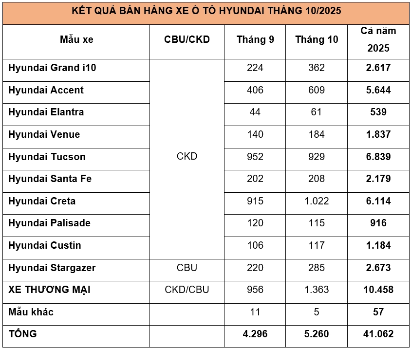 Bảng tổng hợp doanh số cụ thể của các mẫu xe Hyundai trong tháng 10/2025: