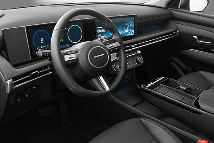 Khoang nội thất Hyundai Tucson nổi bật với cụm màn hình cong, kết hợp giữa màn hình thông tin và màn hình giải trí có cùng kích thước 12.3 inch, hỗ trợ Android Auto/Apple Carplay không dây. Hệ thống điều hòa thông gió đa chiều, có lọc không khí. Cần số điện tử điều khiển nút bấm, âm thanh Bose 8 loa, cửa sổ trời toàn cảnh, Cruise Control, sưởi và làm mát ghế, phanh tay điện tử, gạt mưa tự động, dừng xe thông minh Autohold, Camera 360, đèn viền nội thất 64 màu sắc…
