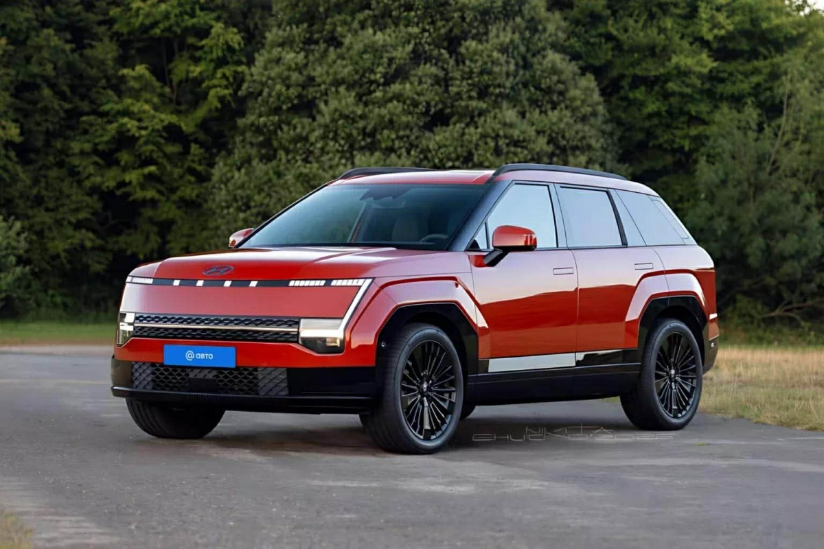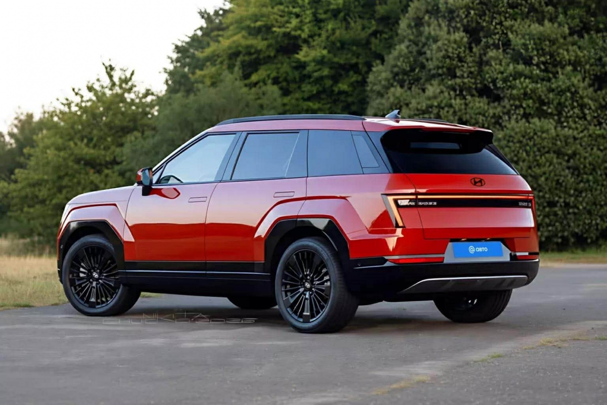 Lưới tản nhiệt được đặt thấp hơn, tách thành hai phần và kết hợp với các đường nét thân xe sắc cạnh. Nhìn từ bên hông, chiếc SUV có nhiều điểm tương đồng với Hyundai Santa Fe mới như hốc bánh vuông vức, các chi tiết ốp nhựa đen và tay nắm cửa dạng ẩn nằm phẳng với thân xe.