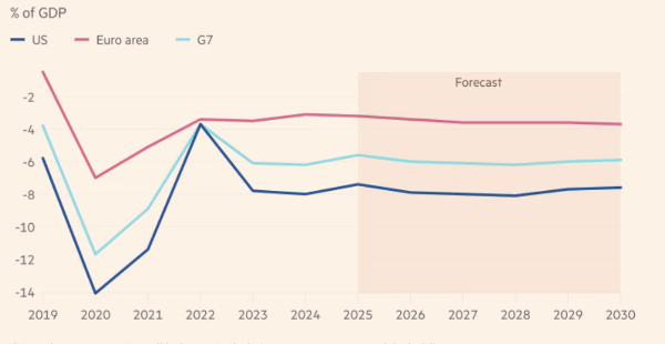 Tỷ lệ thâm hụt ngân sách chính phủ hàng năm của Mỹ, khu vực đồng euro, và nhóm G7 từ năm 2019 đến năm 2024 và dự báo đến năm 2030 - Nguồn: FT.