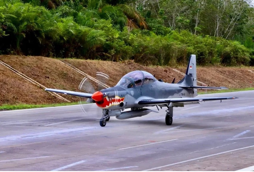 Máy bay EMB-314 Super Tucano thử nghiệm trên cao tốc Terpeka Simpang Pematang ở Lampung. Ảnh: Không quân Indonesia