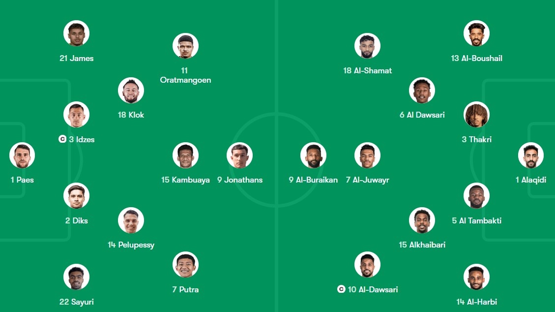 Phút thứ 7, Al Tambaki có pha phòng ngự hớ hênh, dẫn đến quả đá phạt bên cánh phải cho đội khách. Cũng chính hậu vệ số 5 để bóng chạm tay trong nỗ lực cản cú đánh đầu của Kevin Diks trong vùng cấm. Sau khi tham khảo VAR, trọng tài chính cho Indonesia hưởng phạt đền. Diks nhận trọng trách và với kinh nghiệm của một chuyên gia đá 11 m, anh không bỏ lỡ cơ hội để hạ thủ môn đội chủ nhà.