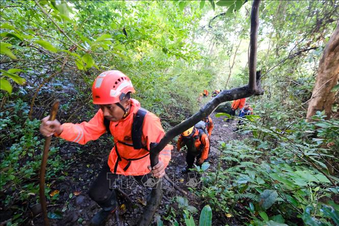 Hình ảnh do Cơ quan Tìm kiếm và Cứu nạn Quốc gia Indonesia công bố cho thấy đội tìm kiếm, cứu nạn phải leo dọc các sườn núi hẹp, trơn trượt, trong điều kiện tầm nhìn rất hạn chế.