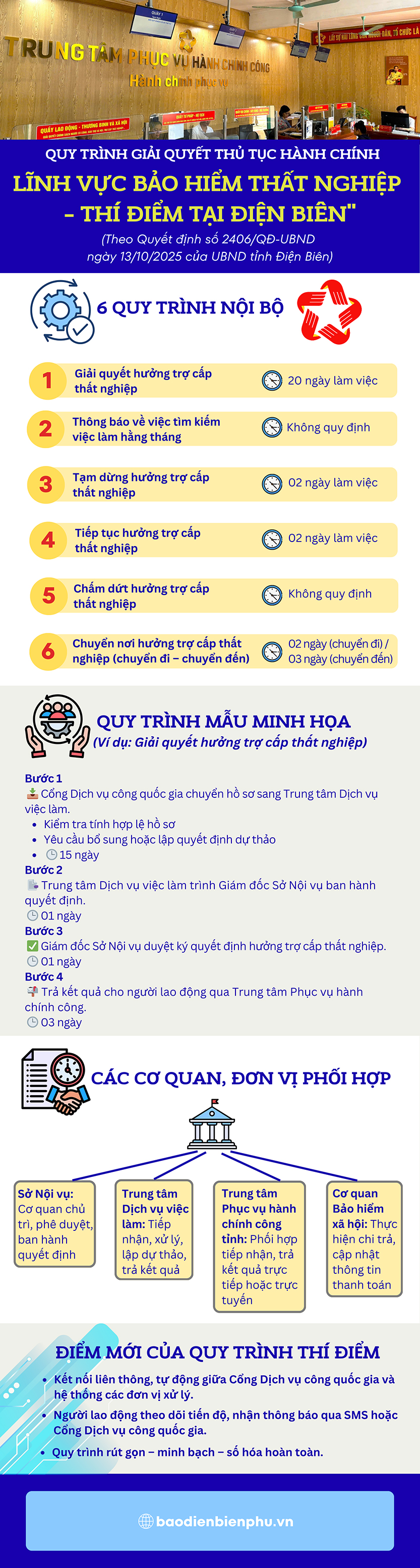 (Nguồn: Quyết định số 2406/QĐ-UBND ngày 13/10/2025 của UBND tỉnh Phê duyệt Quy trình nội bộ trong giải quyết thủ tục hành chính lĩnh vực bảo hiểm thất nghiệp triển khai thí điểm trên cổng Dịch vụ công quốc gia thuộc phạm vi, chức năng quản lý của Sở Nội vụ tỉnh Điện Biên)