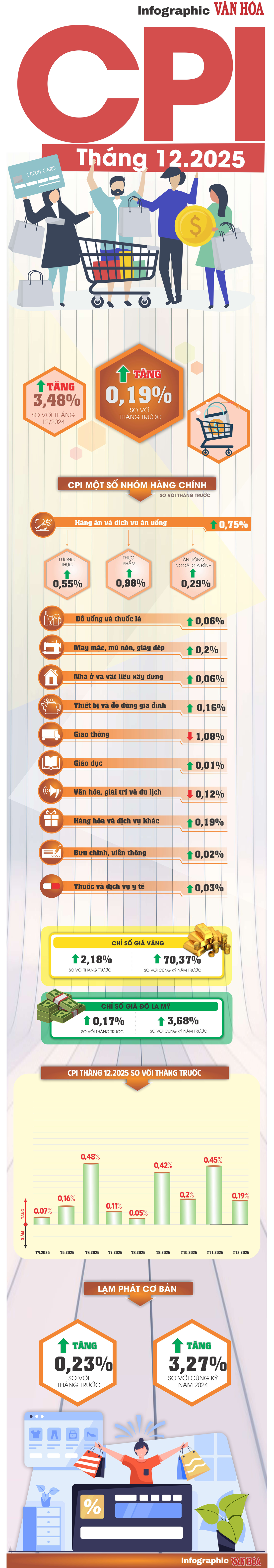 (Infographic) CPI tháng 12.2025 tăng nhẹ, 9/11 nhóm hàng hóa tăng giá