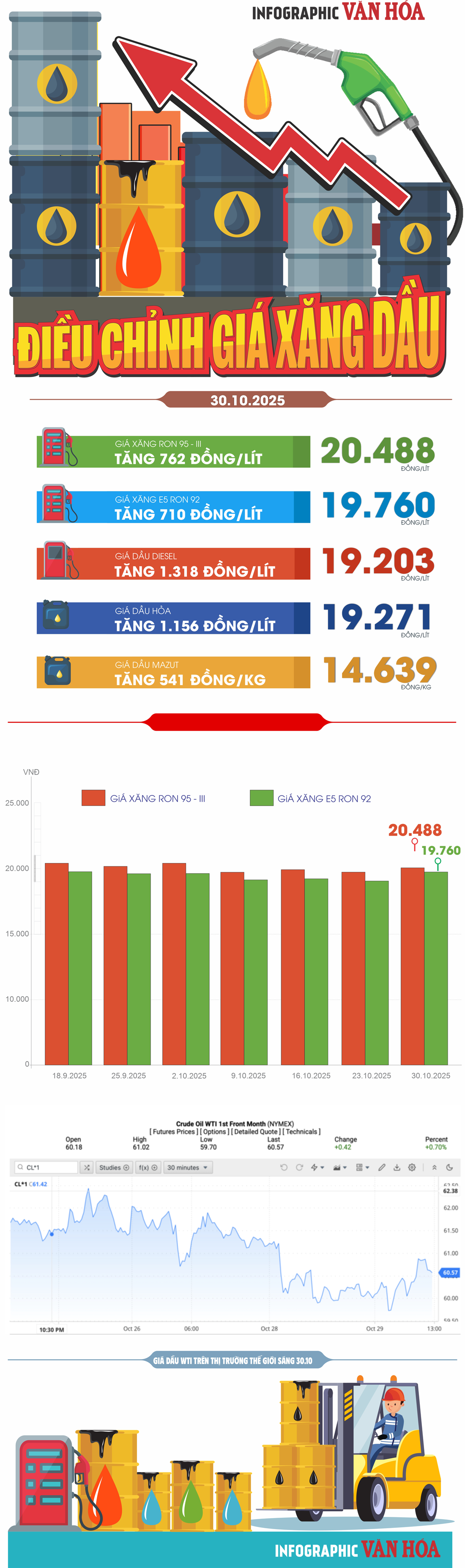 (Infographic) Giá xăng dầu tăng mạnh từ chiều 30.10, RON95 vượt 20.000 đồng/lít