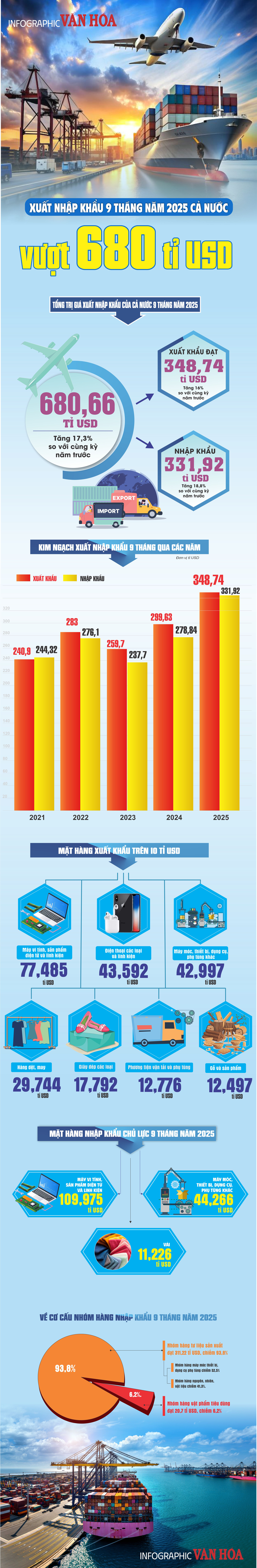(Infographic) Kim ngạch xuất nhập khẩu Việt Nam tăng mạnh, vượt mốc 680 tỉ USD sau 9 tháng