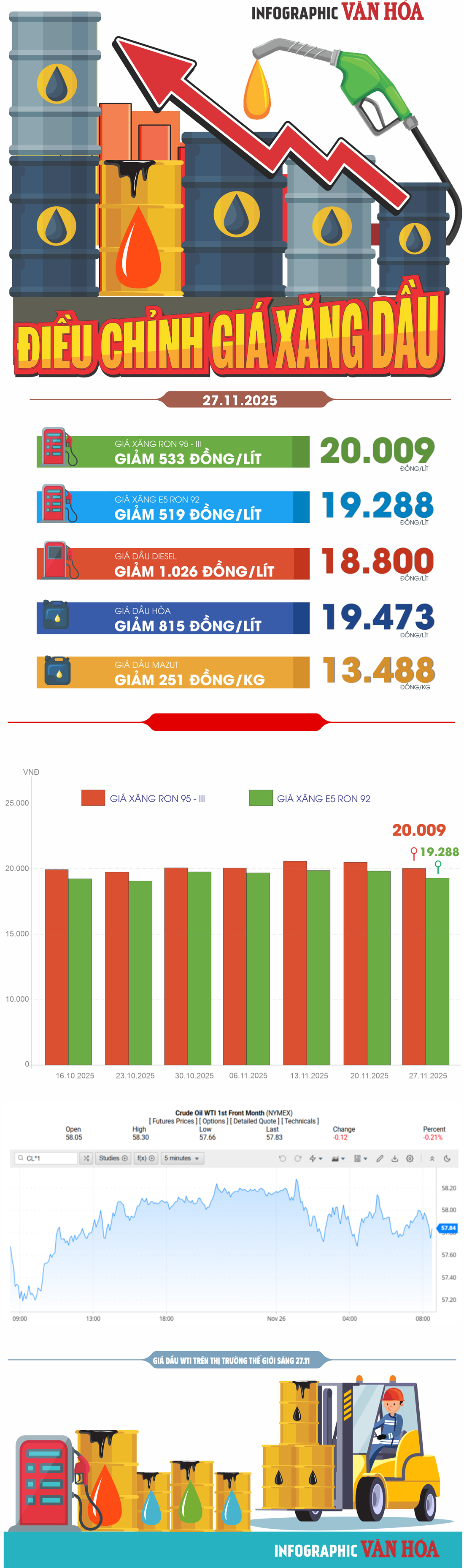 (Infographic) Liên Bộ điều chỉnh, giá xăng dầu đồng loạt lao dốc