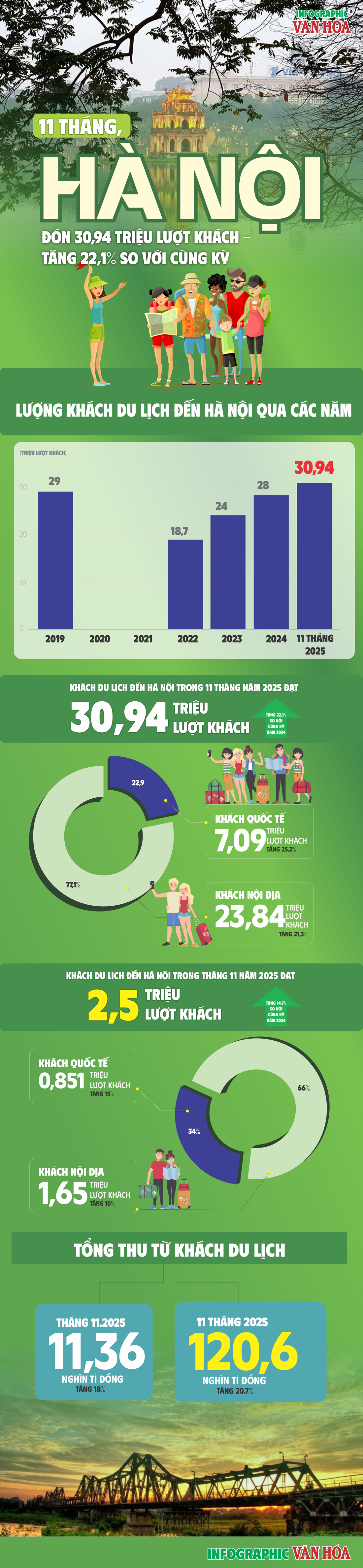 (Infographic) Lượng khách đến Hà Nội lập kỷ lục lịch sử, chạm mốc gần 31 triệu lượt