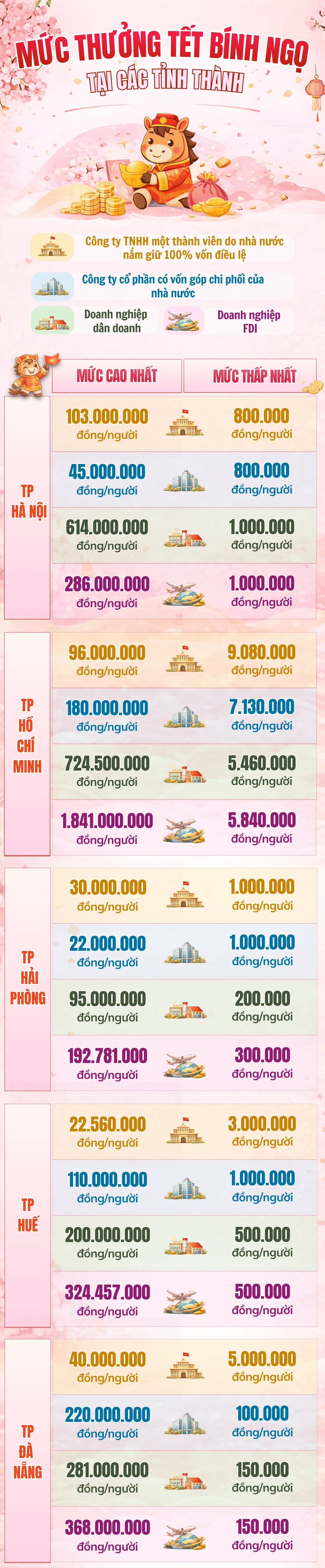Infographic: Mức thưởng Tết Nguyên đán 2026 ở TP.HCM và các tỉnh thành