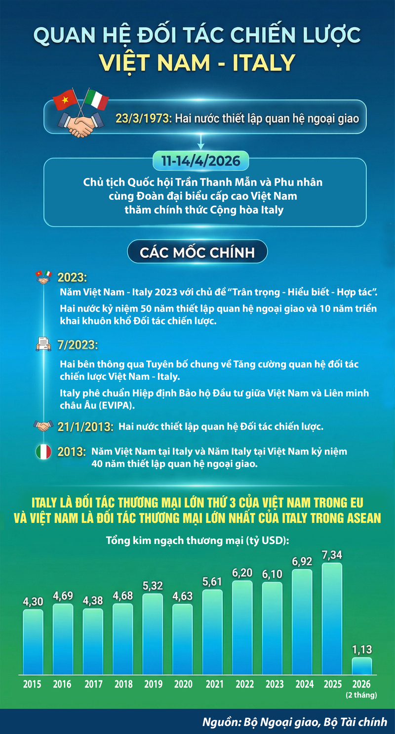 Chuyến thăm Italy của Chủ tịch Quốc hội Trần Thanh Mẫn cùng Phu nhân và Đoàn đại biểu cấp cao Việt Nam nhằm thúc đẩy hợp tác nghị viện giữa hai nước, góp phần đưa quan hệ Đối tác chiến lược Việt Nam - Italy ngày càng đi vào chiều sâu, hiệu quả.
