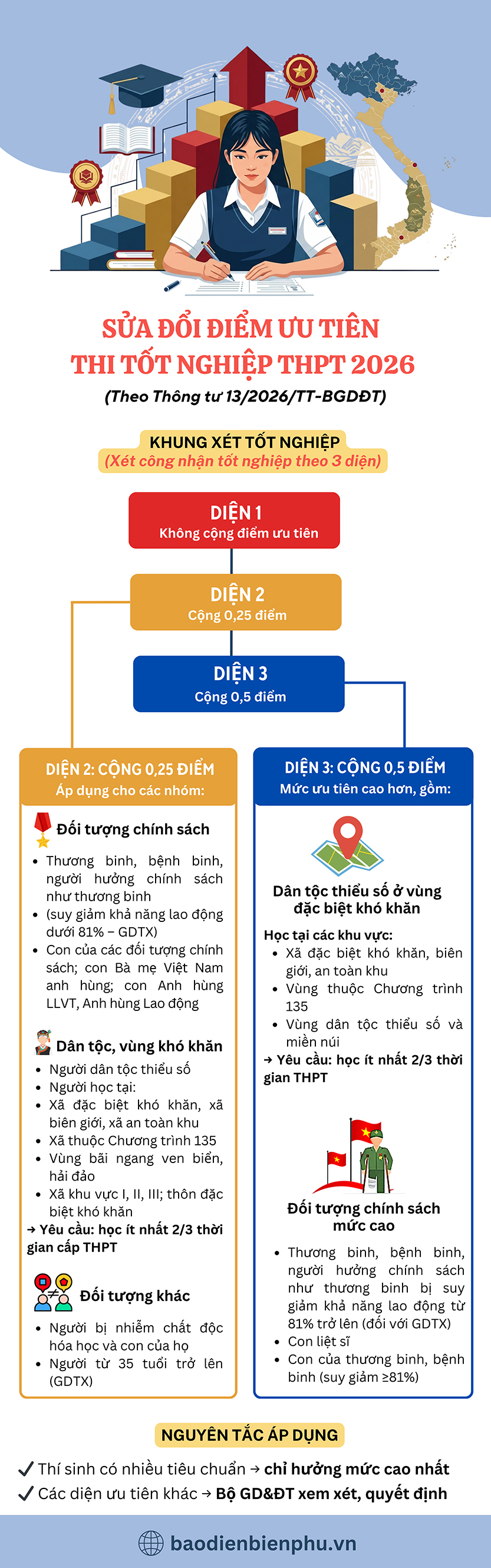 ĐBP - Bộ Giáo dục và Đào tạo vừa ban hành Thông tư 13/2026/TT-BGDĐT quy định về việc sửa đổi, bổ sung quy chế thi tốt nghiệp THPT. Điểm mới đáng chú ý là sự phân định rõ ràng các diện xét công nhận tốt nghiệp gắn liền với mức cộng điểm ưu tiên cụ thể cho từng nhóm đối tượng. Theo đó, thí sinh thuộc diện 2 và diện 3 sẽ được hưởng mức điểm ưu tiên lần lượt là 0,25 và 0,5 điểm, tập trung hỗ trợ nhóm đối tượng chính sách, người dân tộc thiểu số và học sinh tại các địa bàn đặc biệt khó khăn. Quy định mới này nhằm đảm bảo tính công bằng, khách quan và sát thực tiễn trong công tác tuyển sinh và đào tạo hiện nay.