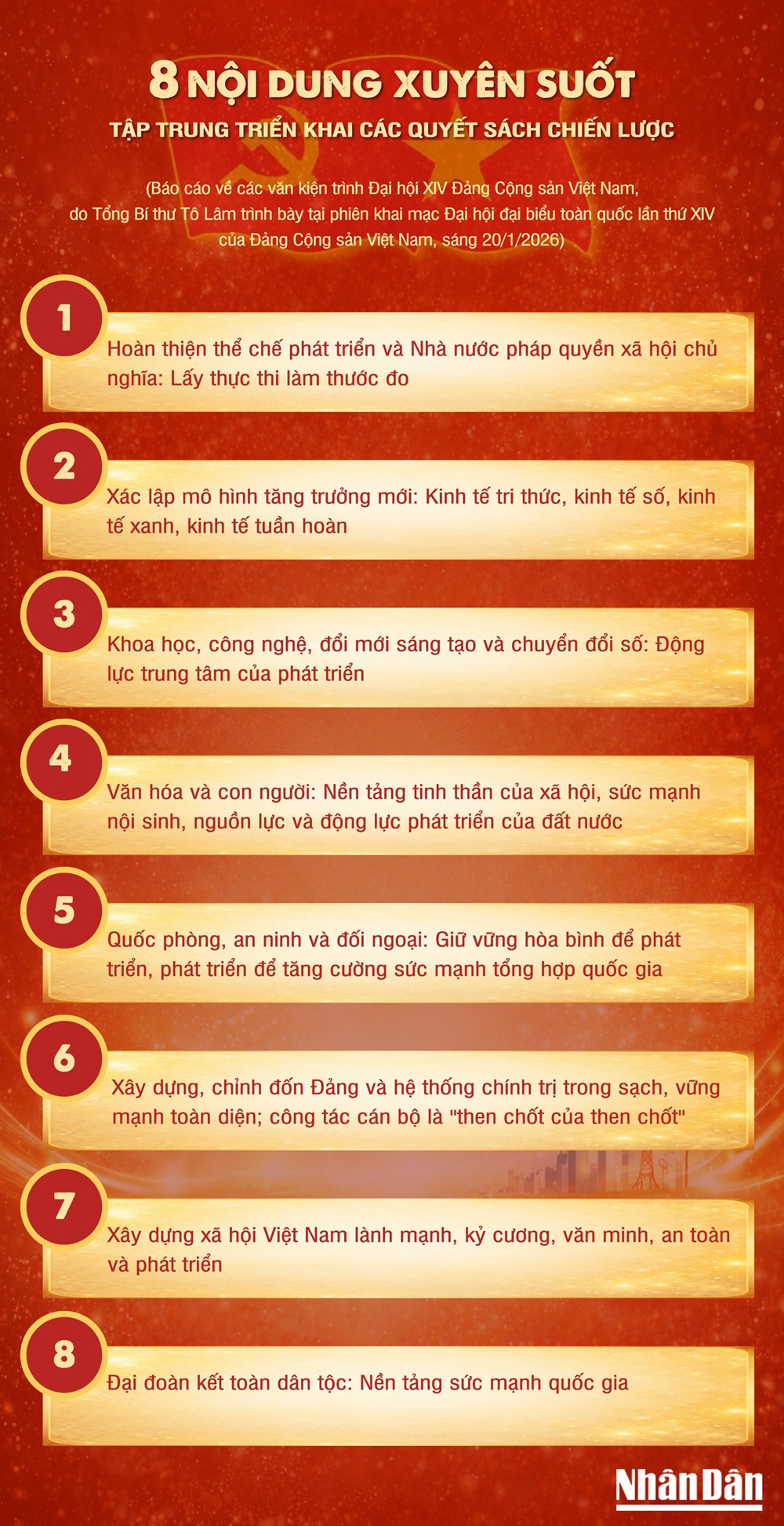 [Infographic] Tám nội dung xuyên suốt tập trung triển khai các quyết sách chiến lược