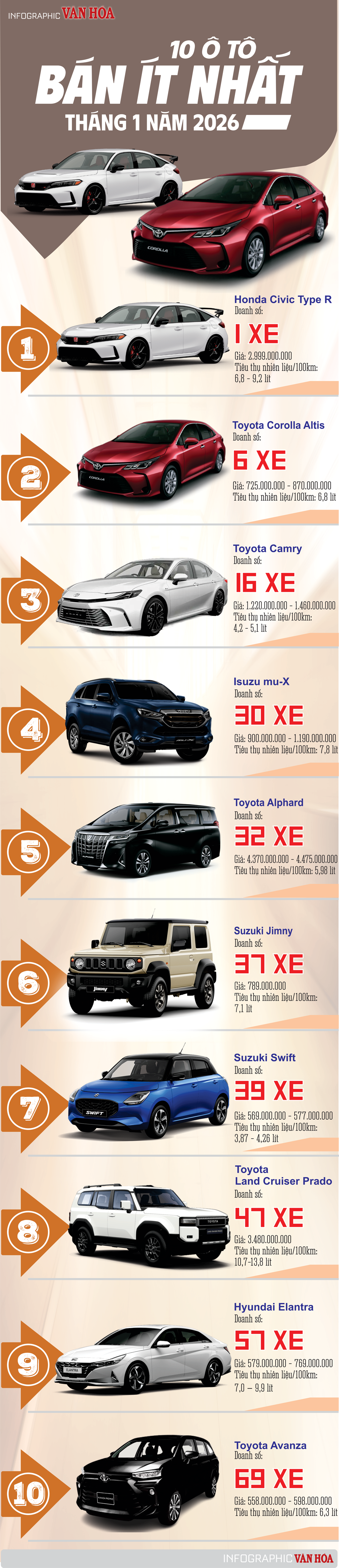 (Infographic) Top 10 mẫu ô tô bán chậm nhất Việt Nam tháng 1.2026