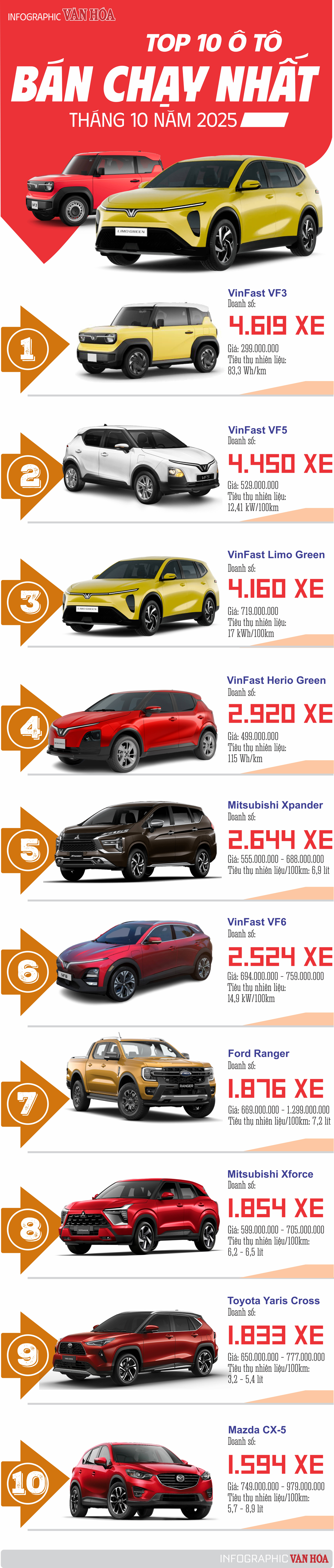 (Infographic) VinFast áp đảo thị trường: VF 3 dẫn đầu top 10 xe bán chạy tháng 10.2025