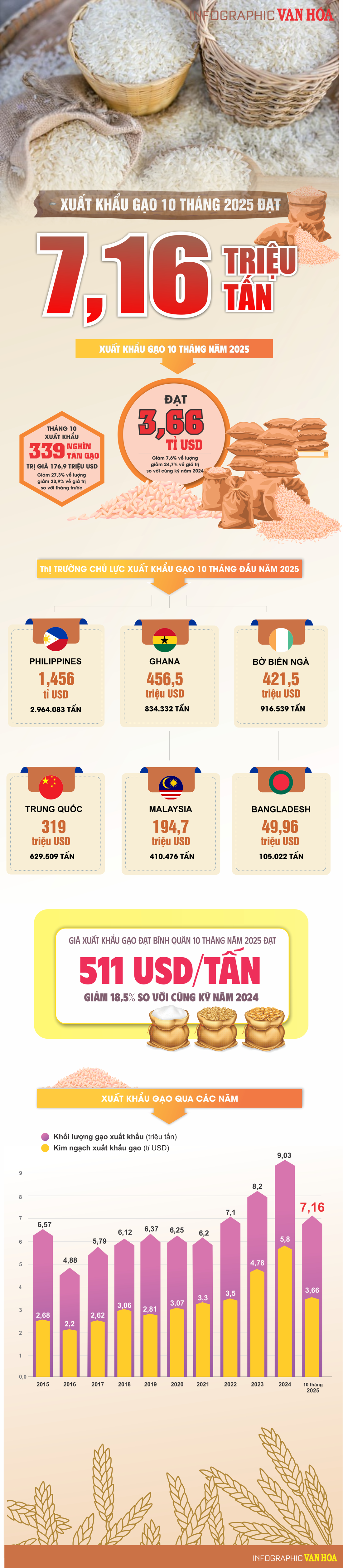(Infographic) Xuất khẩu gạo Việt Nam giảm mạnh giá trị sau 10 tháng 2025