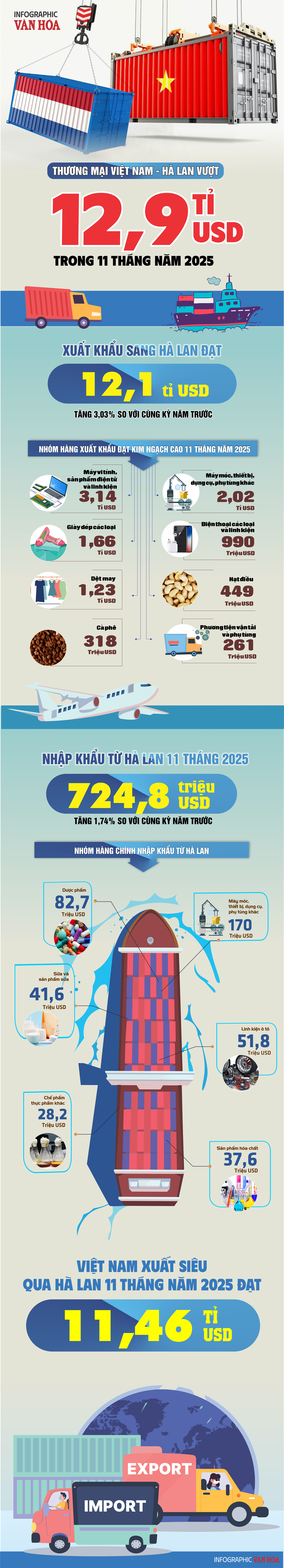 (Infographic) Xuất khẩu sang Hà Lan đạt 12,1 tỉ USD, Việt Nam xuất siêu kỷ lục
