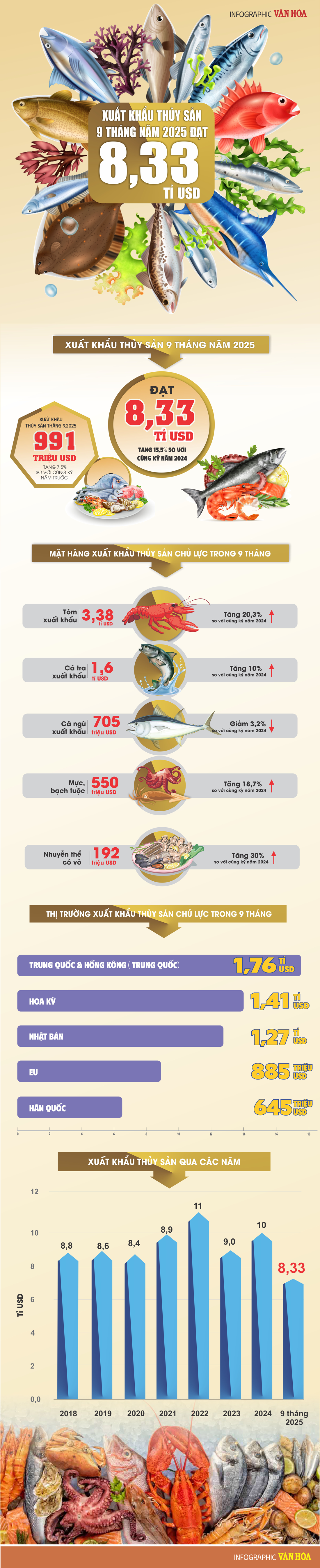 (Infographic) Xuất khẩu thủy sản 9 tháng đạt 8,33 tỉ USD, tôm dẫn đầu tăng 20,3%