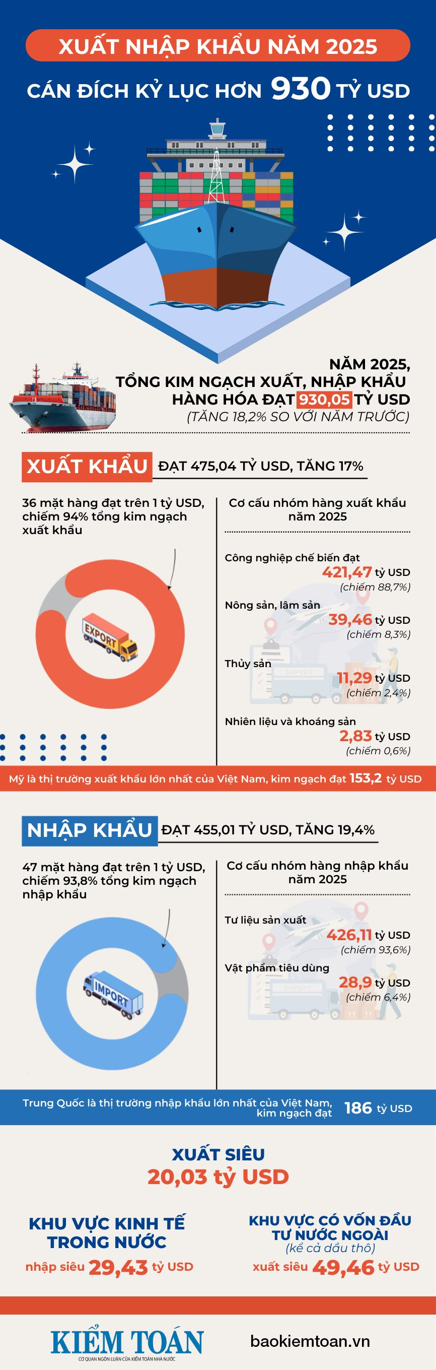 Infographics: Xuất nhập khẩu hàng hóa năm 2025 cán đích kỷ lục hơn 930 tỷ USD