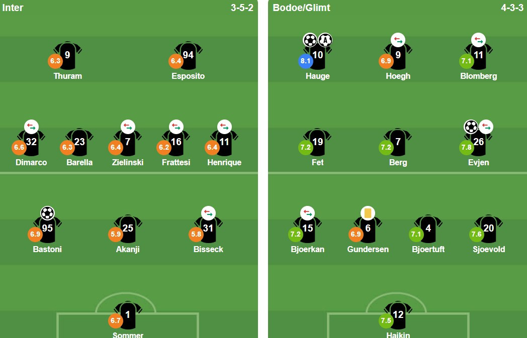 Nỗi đau của các Interista được đẩy lên đỉnh điểm ở phút 72. Lại là Hauge tỏa sáng với đường kiến tạo chuẩn xác để Hakon Evjen dứt điểm tinh tế hạ gục Sommer, nâng tỷ số lên 2-0. Lúc này, tổng tỷ số sau hai lượt trận đã là 5-1 nghiêng về Bodo/Glimt, khiến hy vọng đi tiếp của Inter gần như bị dập tắt hoàn toàn.