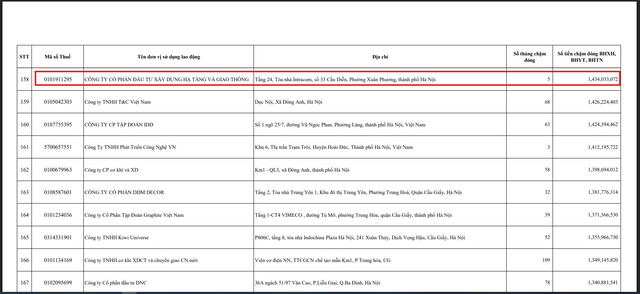 Ngoài những cái tên “quen thuộc” như CTCP Anh ngữ Apax, CTCPLILAMA3,…thì danh sách này cũng xuất hiện một doanh nghiệp đáng chú ý là Côngty CP Đầu tư xây dựng hạ tầng và giao thông (Intracom, địa chỉ: Tầng 24, Toànhà Intracom, số 33 Cầu Diễn, phường Xuân Phương, TP.Hà Nội) cũng bị “điểm tên”với số tháng chậm đóng là 5 tháng, số tiền chậm đóng 1,4 tỷ đồng.