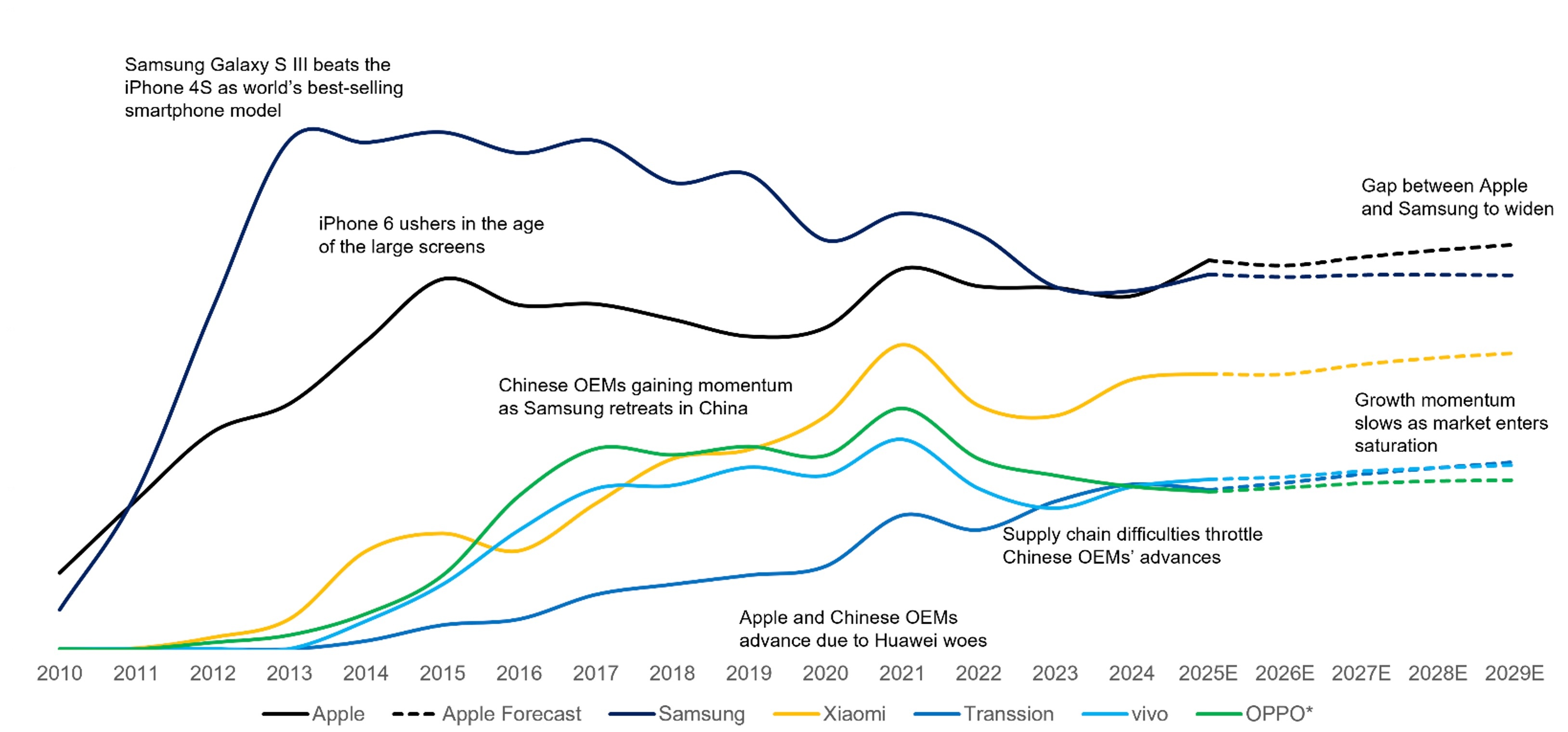 Sản lượng smartphone toàn cầu của một số hãng giai đoạn 2010-2029 (ước tính). Ảnh: Counterpoint Research.