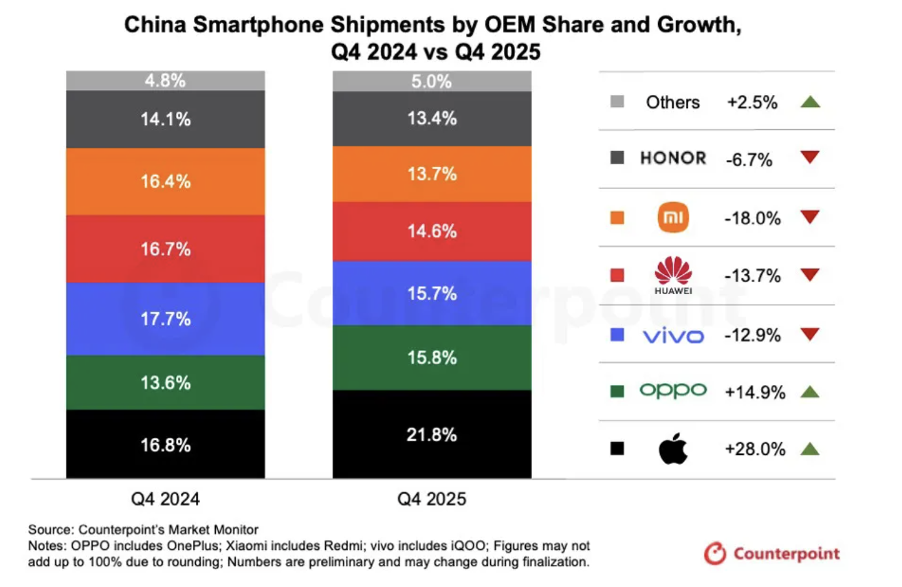 Theo báo cáo mới nhất của Counterpoint Research, trong khi lượng smartphone xuất xưởng tại Trung Quốc giảm 1,6% trong quý IV năm 2025 so với cùng kỳ, thì lượng máy iPhone xuất xưởng của Apple lại tăng tới 28% so với quý IV năm 2024.